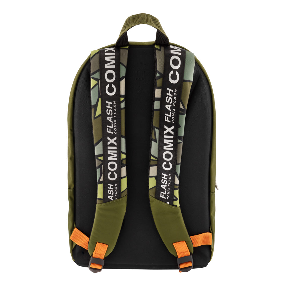 Тийнейджърска ежедневна раница в ярки цветове. Оригинален италиански продукт от бранда COMIX.Основно голямо отделение, до самия гръб на раницата с джоб за лаптоп и документи. Втори голям джоб по средата. Трети джоб на предния панел с органайзер (вътрешни джобове с ципове и прегради за съхранение на ученически пособия). Уникална flash електронна лента на предния панел, захранвана с батерия (включена в раницата). Лента се управлява от елегантен интерниран гумен бутон на предния панел, който сменя 5 различни неонови цвята (оранж, червен, жълт син и лилав). Голям холограмен надпис COMIX, разположен на предния панелЗатваряне на всички отделения със стабилни ципове с метален гравиран COMIX накрайник.Вентилиран анатомичен гръб с подплата. Здрава и удобна ръкохватка (дръжка). Подплатени против изпотяване от вътрешната страна регулируеми презрамки. Брандирани презрамки COMIX.Промазана водоотблъскваща материя по цялата раница. Усилена против износване материя от твърда пяна в долната част на раницата.. Размери: височина 44 см, ширина 32 см и дълбочина 22 см.Материал: полиестер