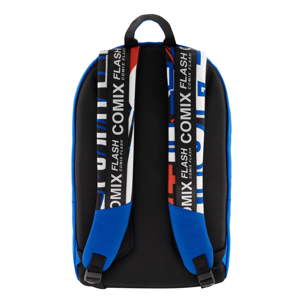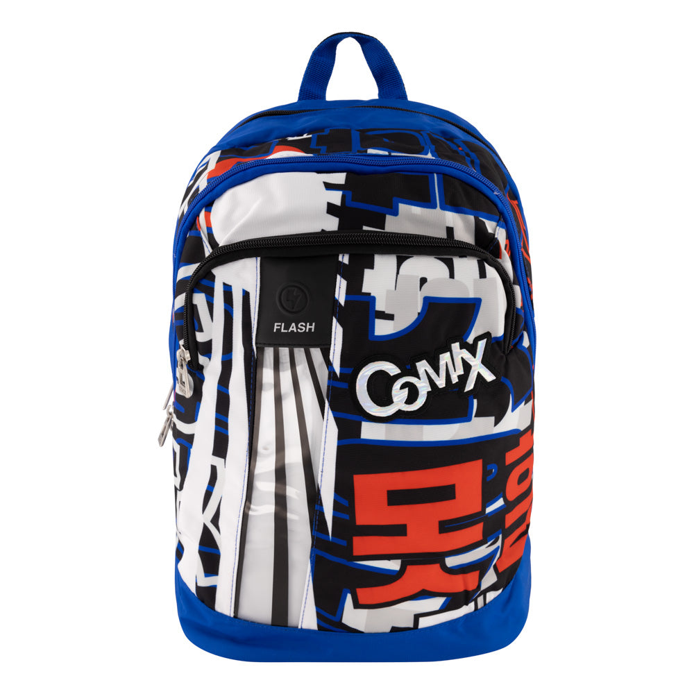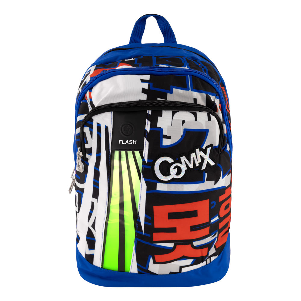 Тийнейджърска ежедневна раница в ярки цветове. Оригинален италиански продукт от бранда COMIX.Основно голямо отделение, до самия гръб на раницата с джоб за лаптоп и документи. Втори голям джоб по средата. Трети джоб на предния панел с органайзер (вътрешни джобове с ципове и прегради за съхранение на ученически пособия). Уникална flash електронна лента на предния панел, захранвана с батерия (включена в раницата). Лента се управлява от елегантен интерниран гумен бутон на предния панел, който сменя 5 различни неонови цвята (оранж, червен, жълт син и лилав). Голям холограмен надпис COMIX, разположен на предния панелЗатваряне на всички отделения със стабилни ципове с метален гравиран COMIX накрайник.Вентилиран анатомичен гръб с подплата. Здрава и удобна ръкохватка (дръжка). Подплатени против изпотяване от вътрешната страна регулируеми презрамки. Брандирани презрамки COMIX.Промазана водоотблъскваща материя по цялата раница. Усилена против износване материя от твърда пяна в долната част на раницата.. Размери: височина 44 см, ширина 32 см и дълбочина 22 см.Материал: полиестер