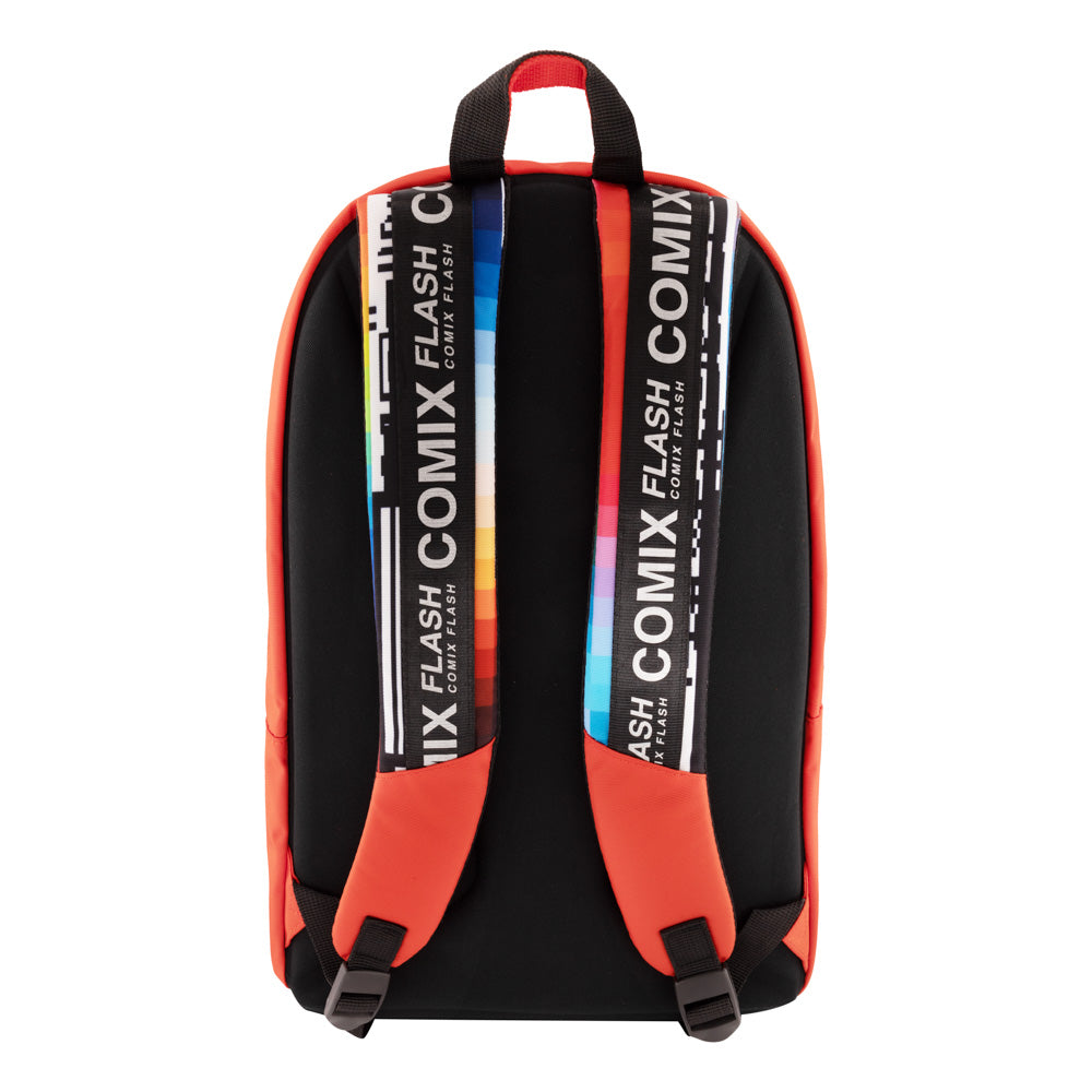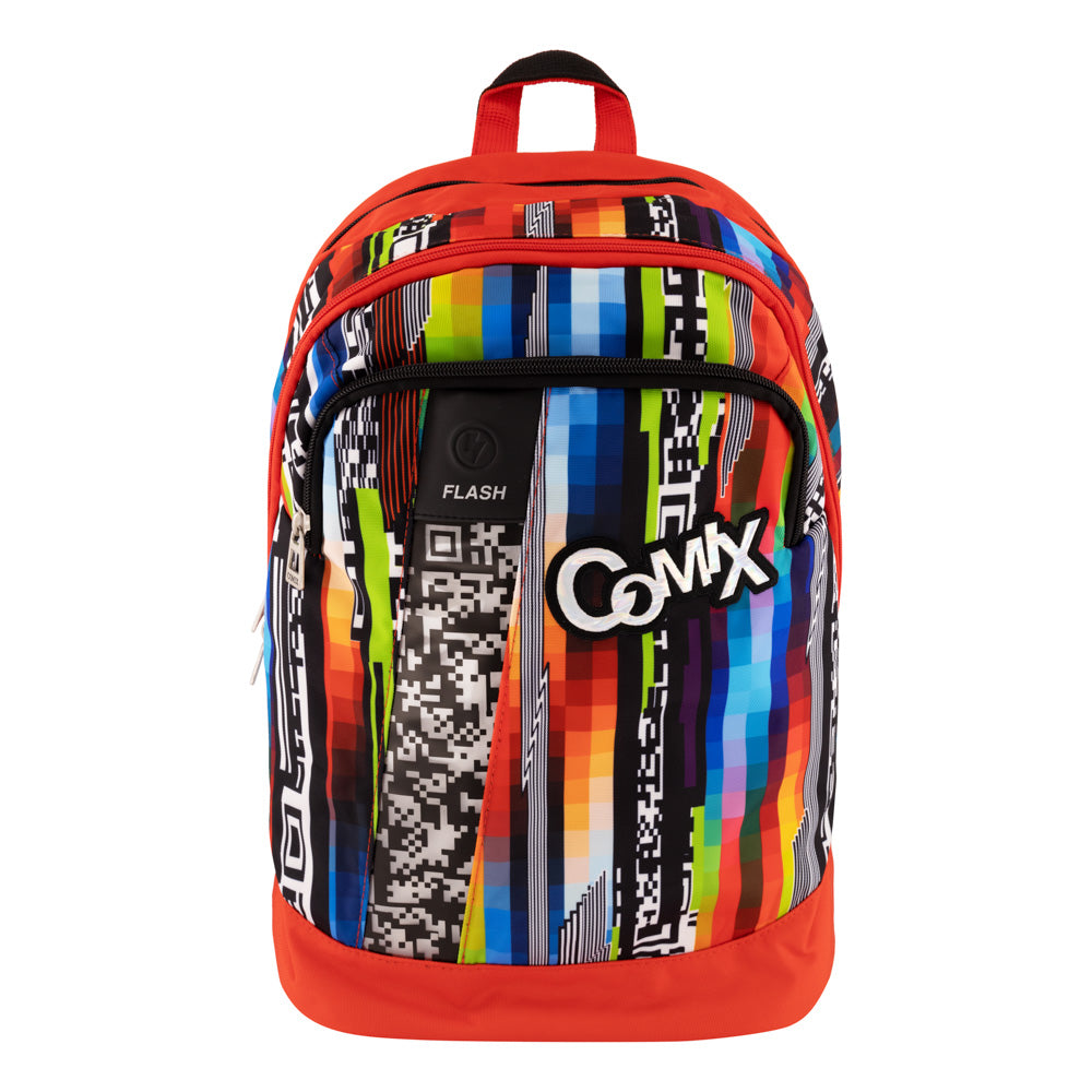 Тийнейджърска ежедневна раница в ярки цветове. Оригинален италиански продукт от бранда COMIX.Основно голямо отделение, до самия гръб на раницата с джоб за лаптоп и документи. Втори голям джоб по средата. Трети джоб на предния панел с органайзер (вътрешни джобове с ципове и прегради за съхранение на ученически пособия). Уникална flash електронна лента на предния панел, захранвана с батерия (включена в раницата). Лента се управлява от елегантен интерниран гумен бутон на предния панел, който сменя 5 различни неонови цвята (оранж, червен, жълт син и лилав). Голям холограмен надпис COMIX, разположен на предния панелЗатваряне на всички отделения със стабилни ципове с метален гравиран COMIX накрайник.Вентилиран анатомичен гръб с подплата. Здрава и удобна ръкохватка (дръжка). Подплатени против изпотяване от вътрешната страна регулируеми презрамки. Брандирани презрамки COMIX.Промазана водоотблъскваща материя по цялата раница. Усилена против износване материя от твърда пяна в долната част на раницата.. Размери: височина 44 см, ширина 32 см и дълбочина 22 см.Материал: полиестер
