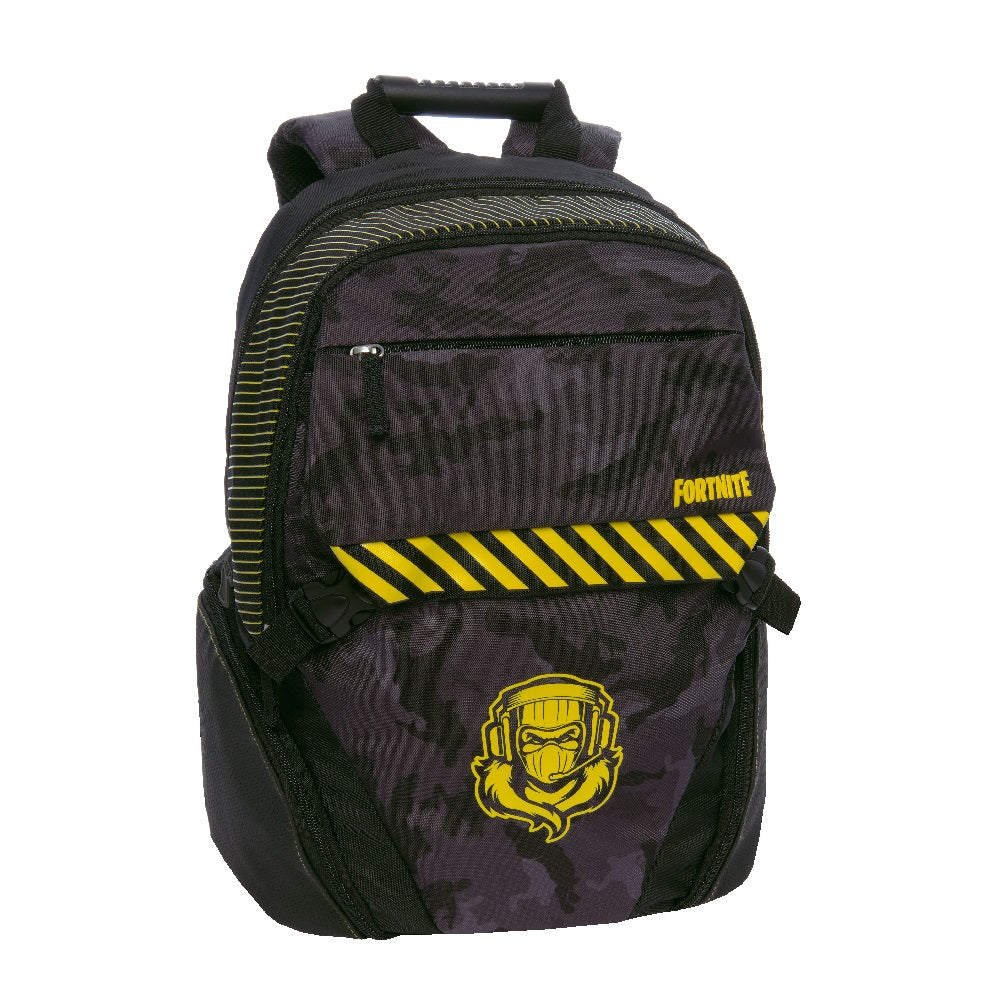 По-малко, но с достатъчни габарити предно отделение/джоб на предния панел, завършващ отново с цип с накрайник от пришит плат. Капак с допълнителен дискретен джоб върху основния преден джоб. Капакът с принт на танцуващи скинове се застопорява посредством катарами като по този начин може да фиксира връхна дреха върху раницата. Сигнално жълто хоризонтално поле и жълт бранд Fortnite.