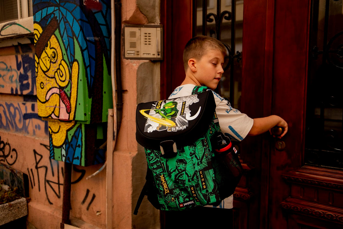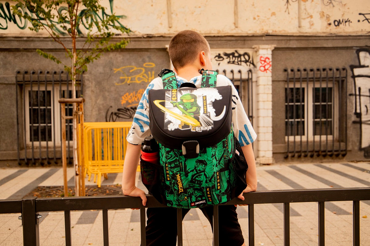 Лека ученическа раница LEGO, която предлага чудесно място за всички учебници и тетрадки. Достатъчно обем още за кутия за обяд и бутилка за вода. Тя има два мрежести странични джоба и функционален джоб отпред, в който се побира идеално LEGO несесер. За да осигури висок комфорт при носене, раницата има вътрешен разделител-джоб, който да държи по-тежките учебници плътно към гърба на ученика, без да се движат свободно в раницата. Заден панел с ергономична форма и регулируеми презрамки. Вътрешен интегриран ключодържател (ринг). Ученическата раница Easy има стабилен капак с катарама, позволяваща отваряне с една ръка. Ученическа програма в джоб, както и етикет за надписване името на детето са пришити по вътрешността на капака. За да се гарантира стабилност на долния панел чантата има заоблени шипове, които повдигат чантата до ниво, защитено от мръсотия и малки локви. Чантата е изработена от водоотблъскващ материал и има рефлектори от четирите страни, осигуряващи висока видимост през тъмната част на денонощието. Страхотна, просторна ученическа раница с много функции. Цветен принт на зелената нинджа Lloyd на капака.