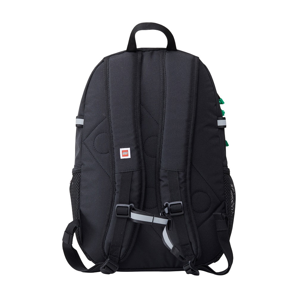 Раницата е с ергономичен, подплатен гръб с пришит контур на тухличка, меки и регулируеми презрамки със здрави катарами. Закопчаване под гърдите за по-прецизно фиксиране към детския гръб, чрез светлоотразителна лента. Водоотблъскваща материя, която трудно задържа мръсотия. Стабилни ципове с метален накрайник, завършващи със зелен iconic LEGO елемент. Здрава дръжка. Два мрежести странични джоба за бутилка с вода.