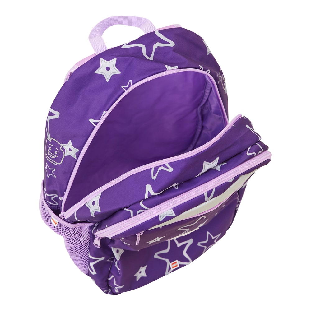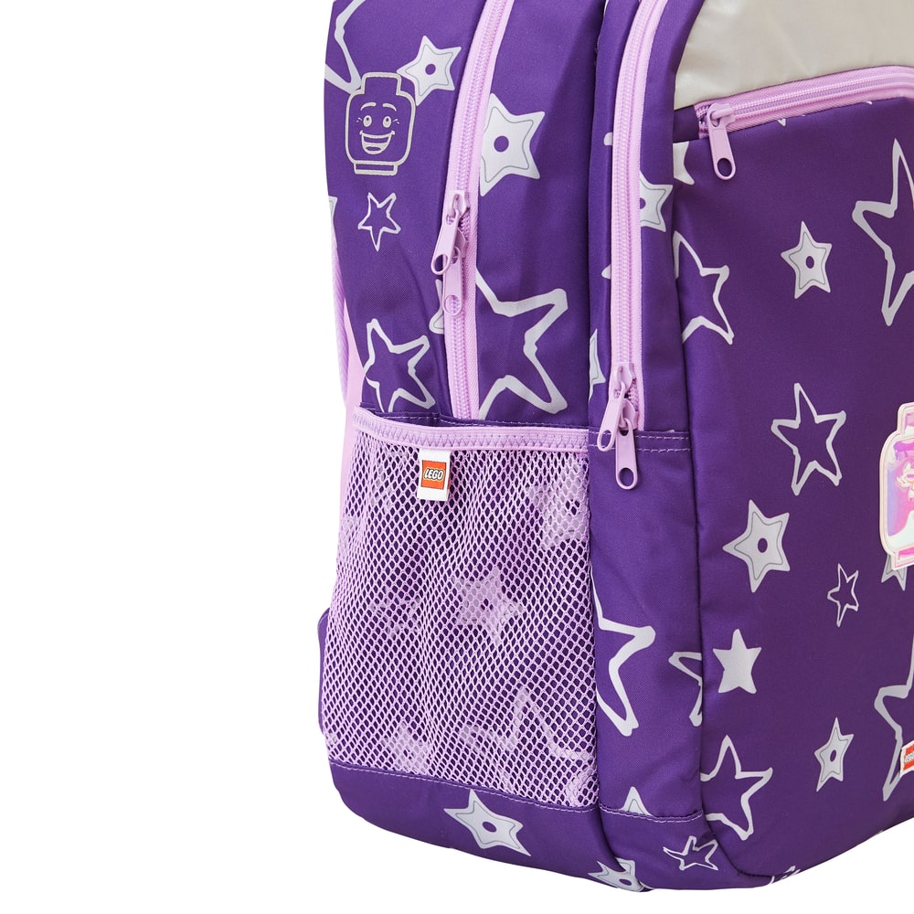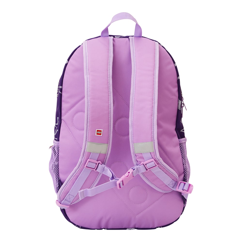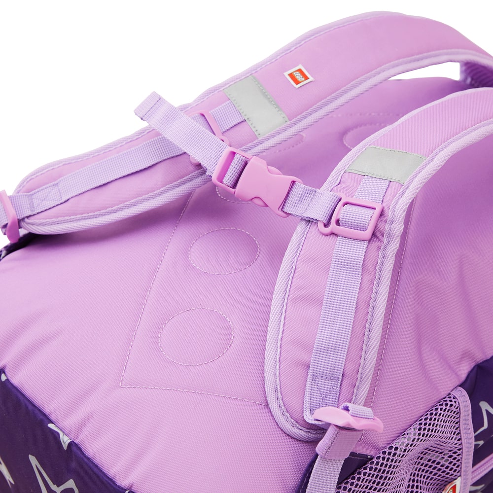 Хастар, брандиран с LEGO тухлички. Етикет за надписаване на името на детето. Релефен гръб, под формата на тухличка. Обемна холограмна момичешка LEGO глава на предния панел. Регулируеми удобни презрамки с катарами за хоризонтално закопчаване пред гърдите.