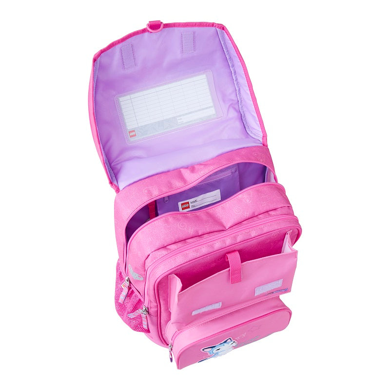 С двете големи отделения, в които може да съберете всичко необходимо за училище, с удобните регулируеми презрамки, допълнителни странични джобове, преден горен джоб за училищен несесер тази раница ще се превърне в едно от приятните усещания с които децата свързват ходенето на училище. Прозрачен джоб със срочната програма пришит в капака. Вътрешен джоб с цип, тип портфейл. Вграден ключодържател (само ринг, без LEGO фигурка). Допълнително устойчивата на мръсотия и водоотблъскваща материя, здравите ципове, и твърдото, стабилно, но леко дъно правят раницата верен другар на ученика години наред.