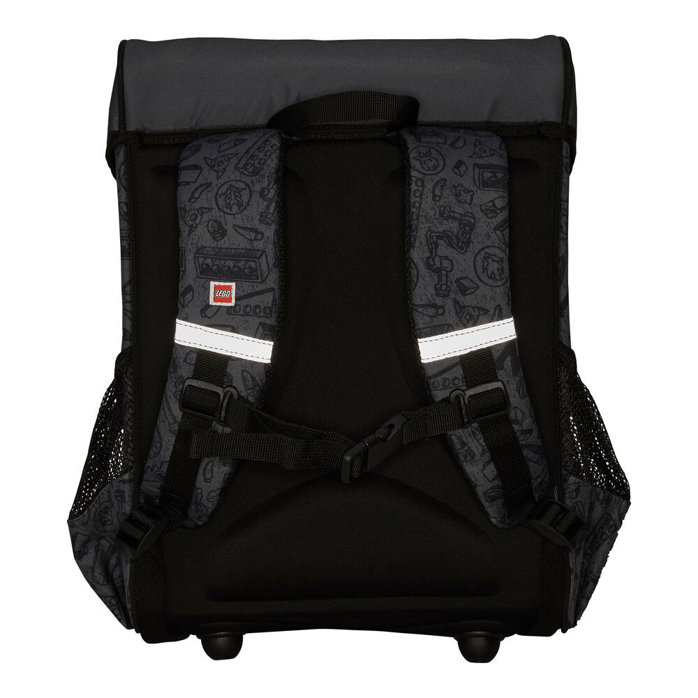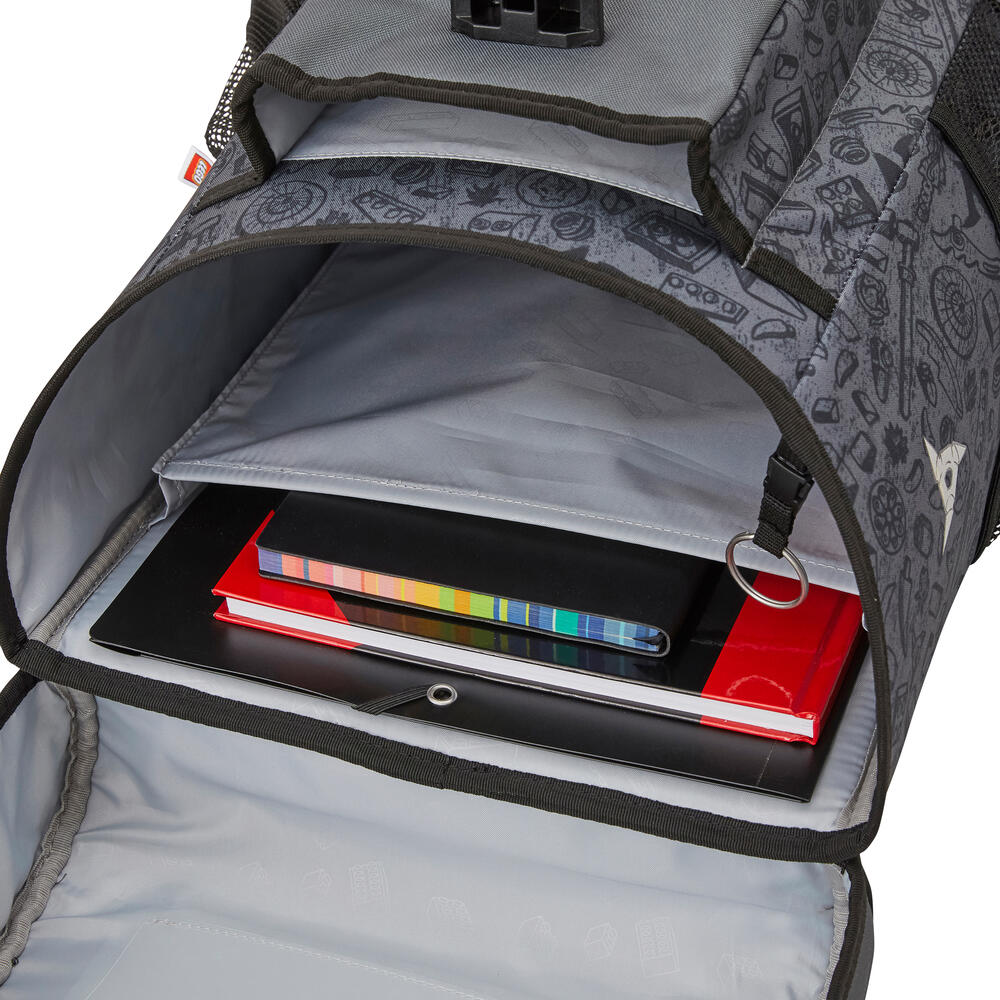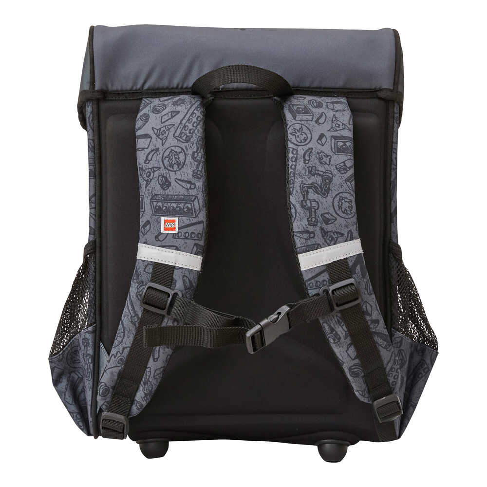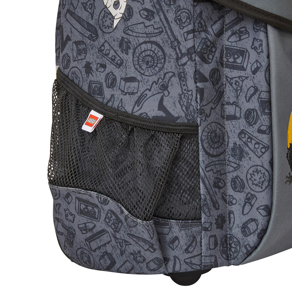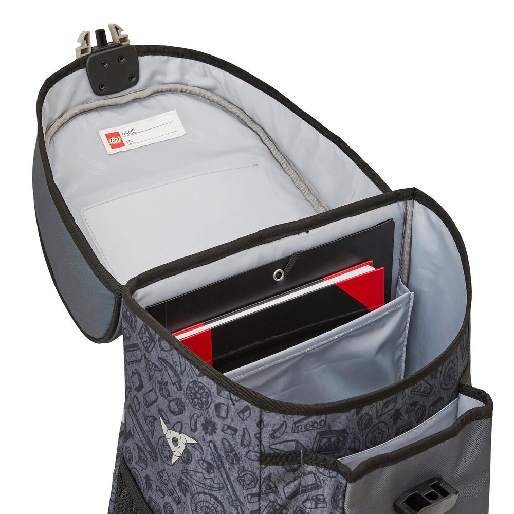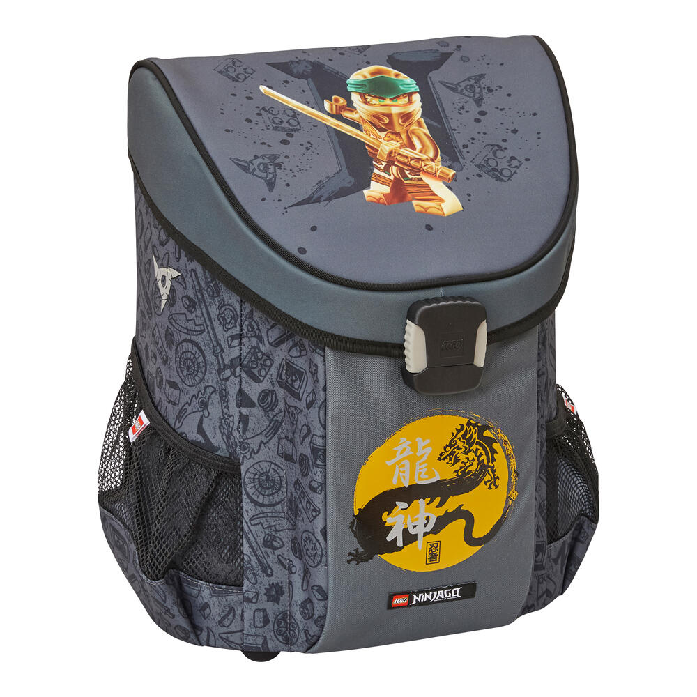 Лека ученическа раница, която предлага чудесно място за всички учебници и тетрадки. Достатъчно обем още за кутия за обяд и бутилка за вода. Тя има два мрежести странични джоба и функционален джоб отпред, в който се побира идеално LEGO несесер. За да осигури висок комфорт при носене, раницата има вътрешен разделител-джоб, който да държи по-тежките учебници плътно към гърба на ученика, без да се движат свободно в раницата.Заден панел с ергономична форма и регулируеми презрамки. Вътрешен интегриран ключодържател (ринг). Ученическата раница Easy има стабилен капак с катарама, позволяваща отваряне с една ръка. Ученическа програма в джоб, както и етикет за надписване името на детето са пришити по вътрешността на капака. За да се гарантира стабилност на долния панел чантата има заоблени шипове, които повдигат чантата до ниво, защитено от мръсотия и малки локви. Чантата е изработена от водоотблъскващ материал и има рефлектори от четирите страни, осигуряващи висока видимост през тъмната част на денонощието. Страхотна, просторна ученическа раница с много функции. Цветен принт на златната нинджа.