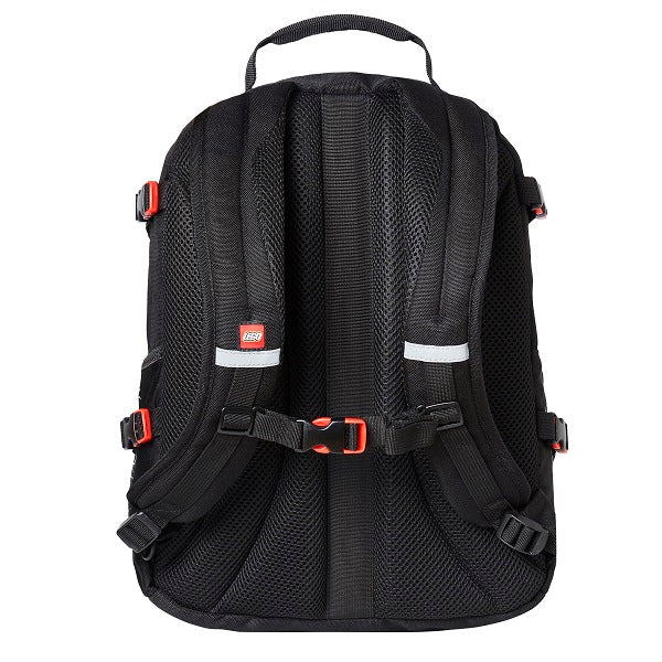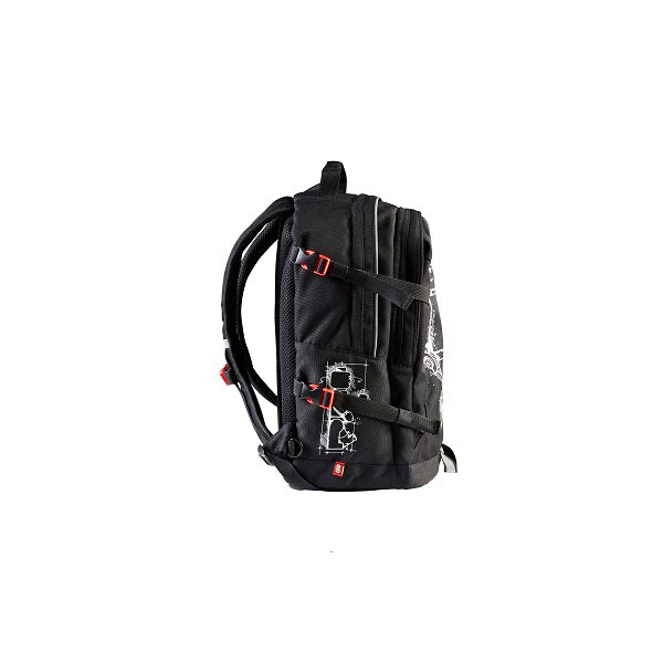 Принтът на огромна класическа минифигура, закачливо оформена, като технически проект навява носталгия по отминалите времена на дизайнерите конструктори. Стилен и елегантен модел в черно със светещ в тъмното и отразяващ принт, основен на задния капак и по-малки странично върху джобовете. Червени катарами за акцент.