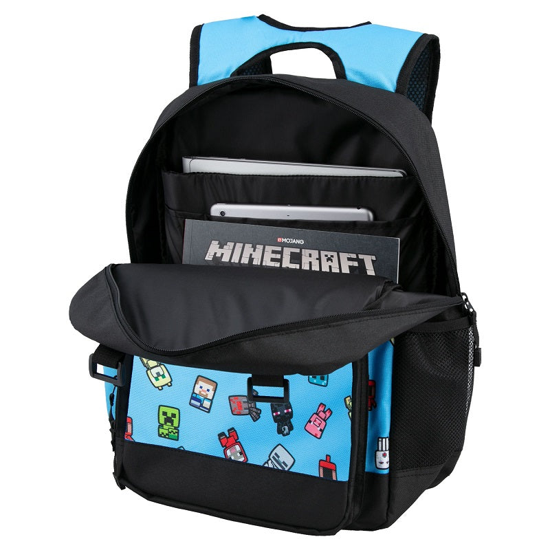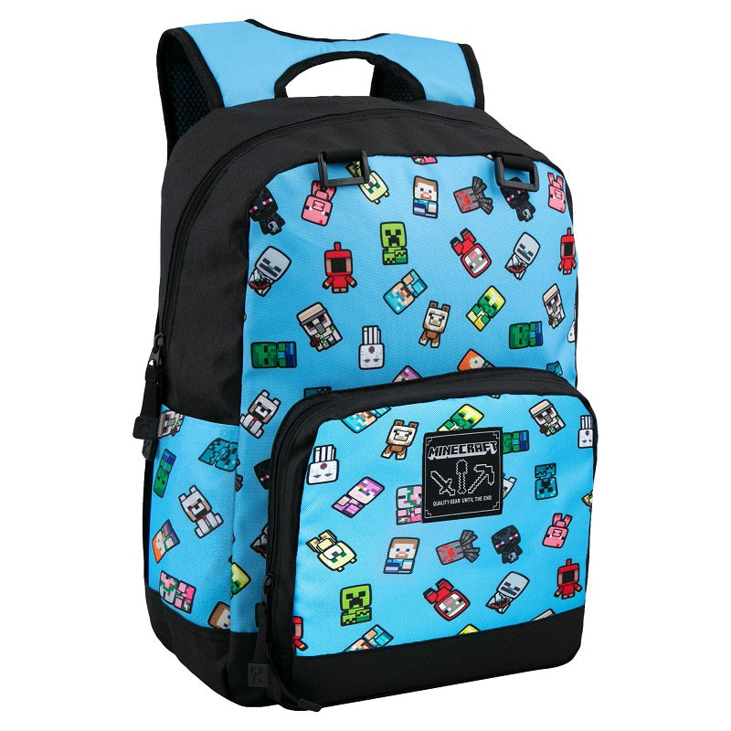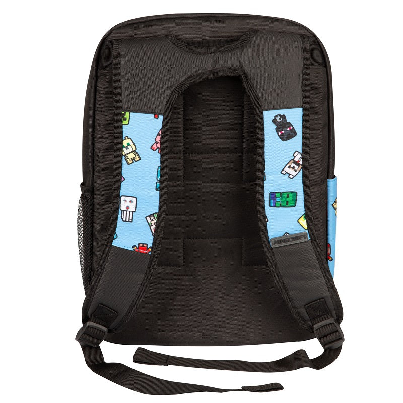 Син дизайн на предния панел със симпатични малки мобове от играта. Принт барове на двете презрамки.