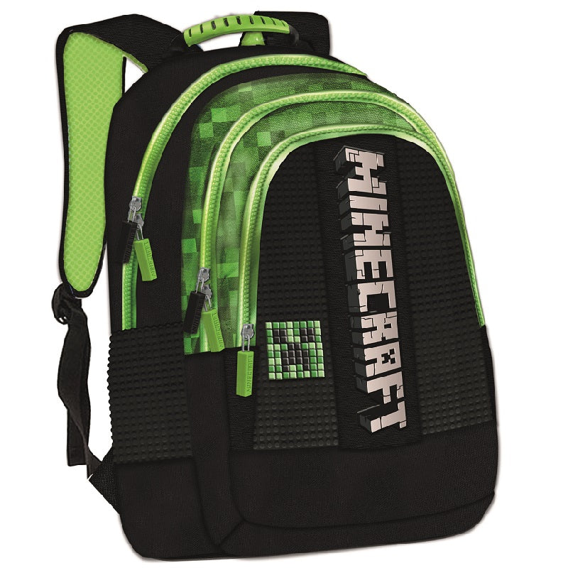 Две големи самостоятелни отделения, които се затварят с масивни и здрави ципове с брандирани гумени накрайници с пиксел. Малък джоб в най-задното отделение. По-тясно, но с достатъчни габарити предно отделение/джоб на предния панел, завършващ отново с цип с гумен накрайник. Класически етикет с тухлички от плат за надписване в предния джоб.  Уникален преден панел с гумени пиксели на които могат да се „кликват“ разноцветни също гумени накрайници (пиксели). Пикселите са обособени в PVC джоб с предложени три култови за електронната игра Minecraft глави на Creeper, Steve и овца, който могат да се асемблират самостоятелно. Страхотен обемен вертикален надпис  MINECRAFT на предния панел, разделящ пикселите по средата.