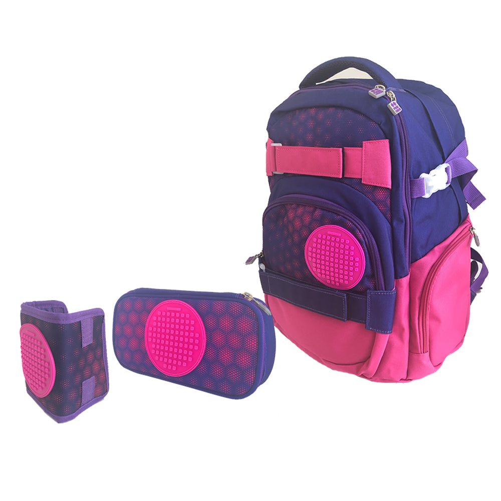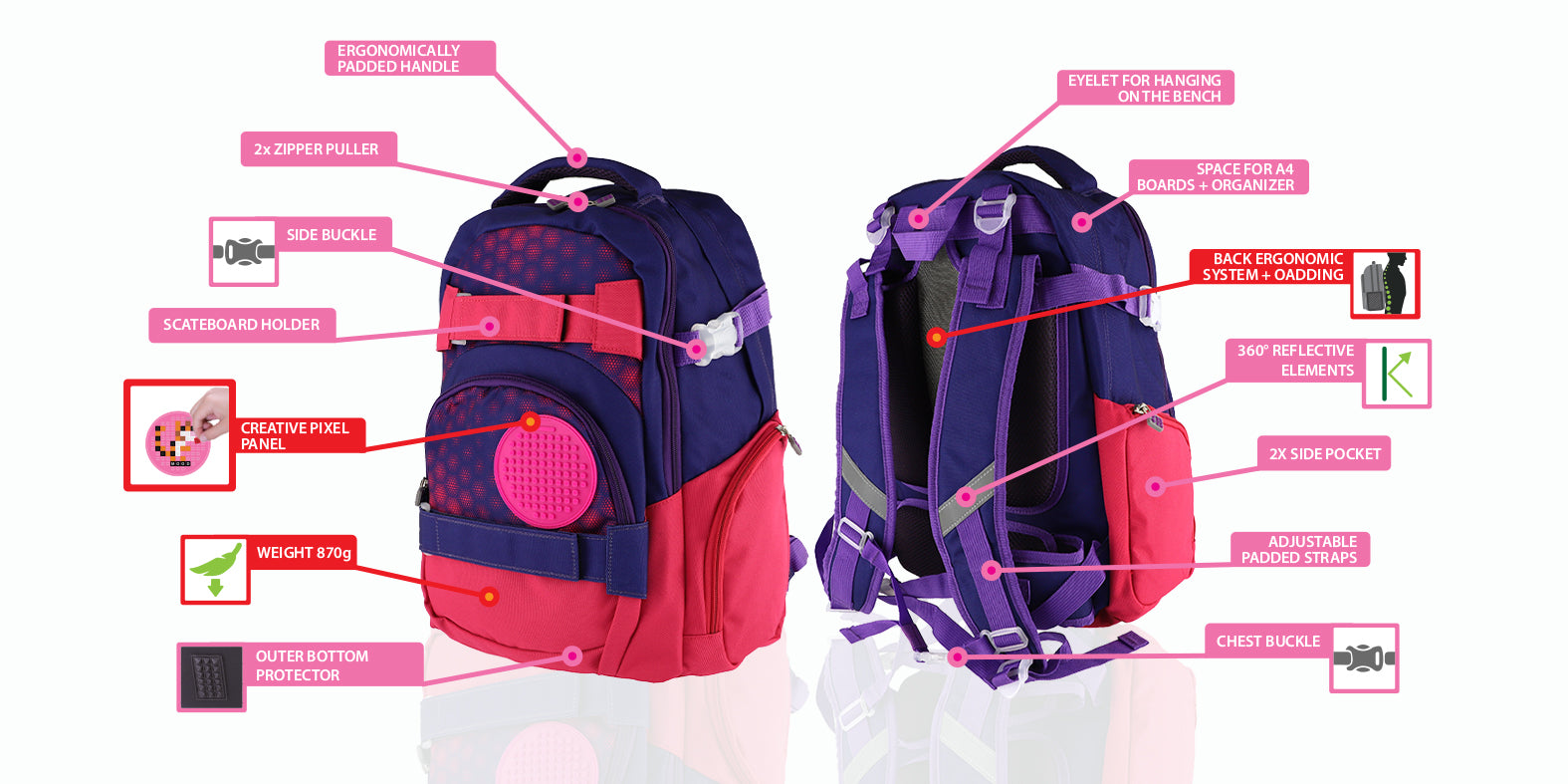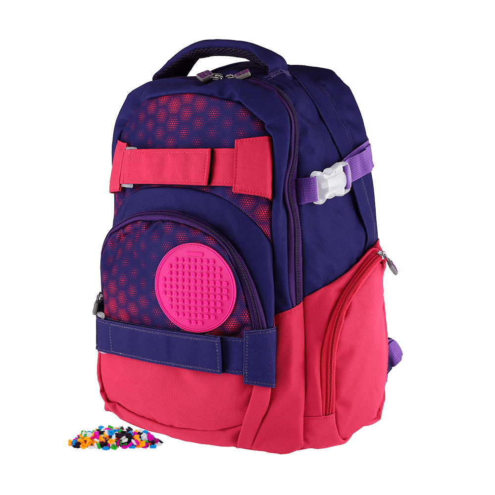 В основното голямо отделение, до самия гръб на раницата, има подплатено отделение за лаптоп, затварящо се чрез велкро лепенка.Средното отделение разполага с органайзер, така че дребните вещи да бъдат винаги подредени.Благодарение на кръглия силиконов панел върху предния джоб, детето ще може да сменя дизайна на раницата всеки ден, подреждайки всички многоцветни пиксели в комплекта.