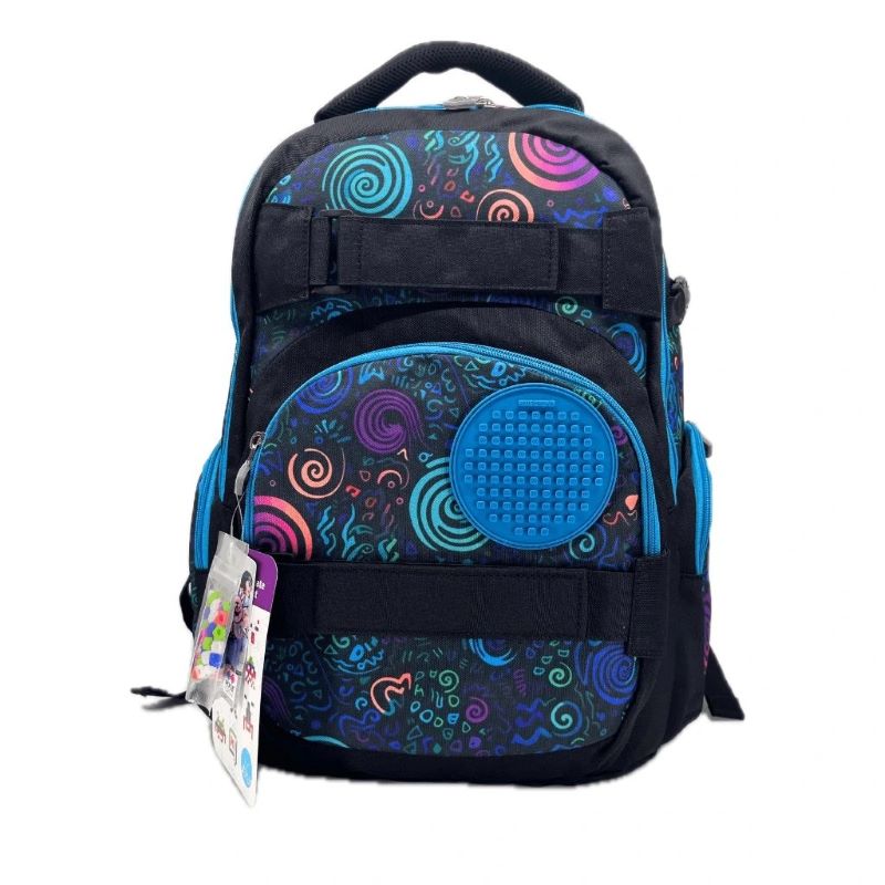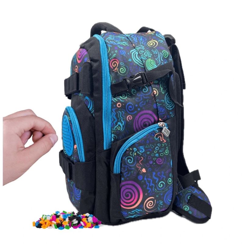 В основното голямо отделение, до самия гръб на раницата, има подплатено отделение за лаптоп, затварящо се чрез велкро лепенка.Средното отделение разполага с органайзер, така че дребните вещи да бъдат винаги подредени.Благодарение на кръглия силиконов панел върху предния джоб, детето ще може да сменя дизайна на раницата всеки ден, подреждайки всички многоцветни пиксели в комплекта.