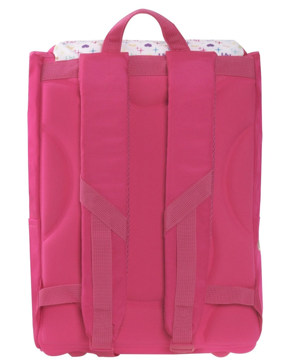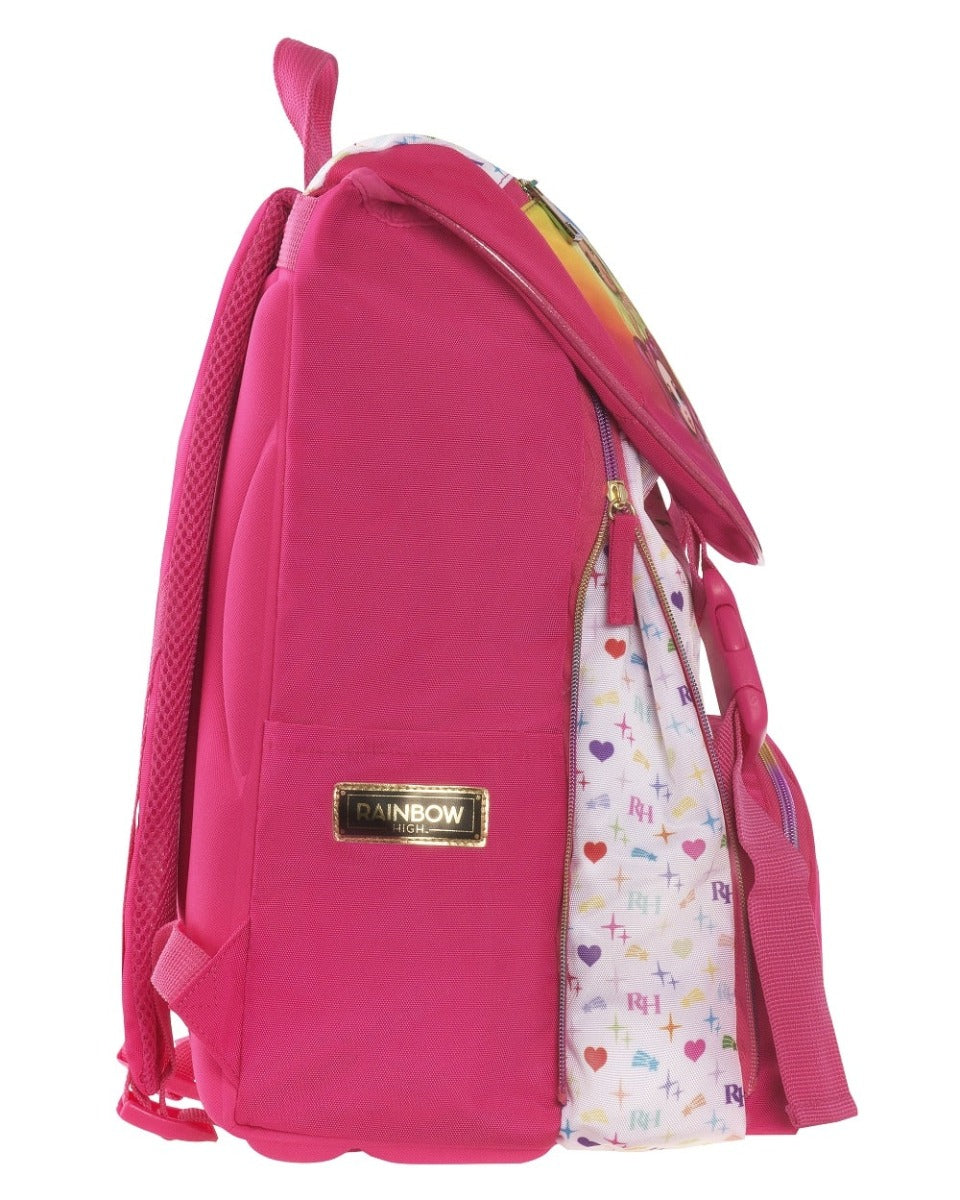 Комфортна ученическа раница Rainbow High, която е достатъчно голяма, за да събере всички учебници, тетрадки и ученически пособия за учебния ден. Тя е с подплатени гръб, дъно и регулируеми презрамки. Във вътрешността си раницата е с две отделения, джоб и плосък вътрешен джоб, затварящи се с цип. В предната ѝ част има два джоба, подходящи за дребни предмети, затварящи се с ципове в цветовете на дъгата.