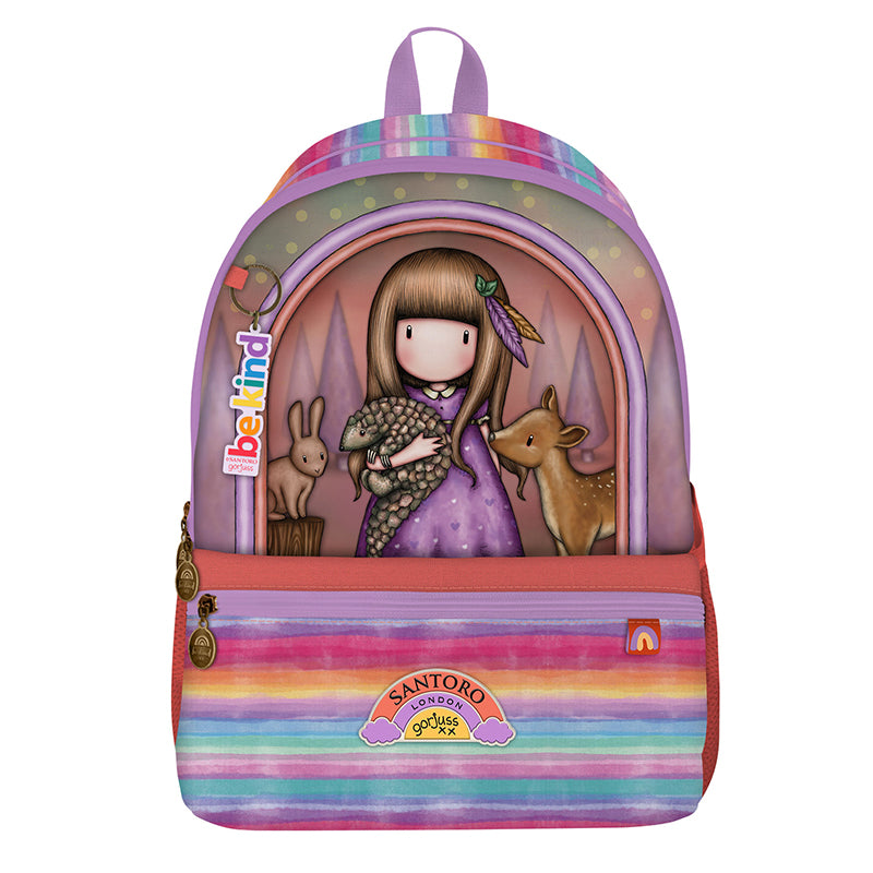 Ученическата раница Santoro Gorjuss "Be Kind To All Creatures" е идеалният спътник за младите ученици, които търсят стил и практичност съчетани в едно. Раницата се състои от две обширни отделения с достатъчно обем вътре. Крайното просторно основно отделение се затваря със здрав объл цип с логото на Santoro Gorjuss. В него има малък самостоятелен джоб с цип. Позволява съхранение на учебници, тетрадки и други ученически принадлежности. Другото отделение е по-малко и отново се затваря с объл цип с логото на Santoro Gorjuss. Също така е закачен гумен ключодържател с надпис ”be kind”.Отпред в долната част има голям дълбок джоб, в който може да стоят портмонето, телефонът или пък ключовете на детето ви. Затваря се със здрав объл цип с логото на Santoro Gorjuss. Върху него има пришит голям гумен бадж Santoro Gorjuss с формата на дъга. Раница е удобна за носене, благодарение на здравите, подплатени и регулируеми презрамки. Освен това разполага с ергономичен гръб, дръжка за хващане и два странични джоба за бутилката за вода на ученика.Раницата е изработена от полиестер. Размери: 30 x 43 x 20 cm