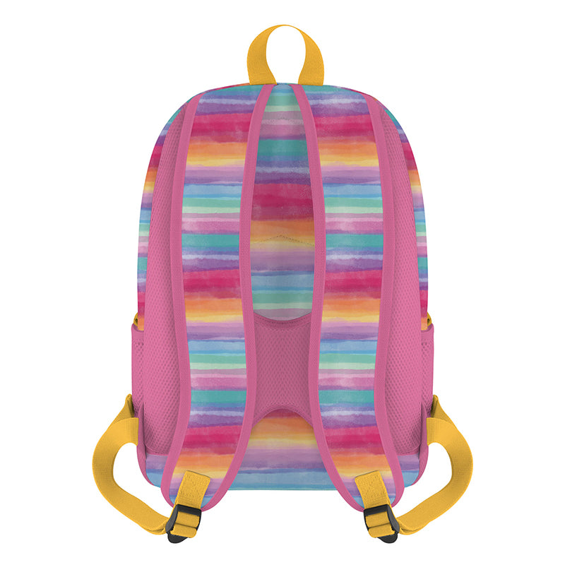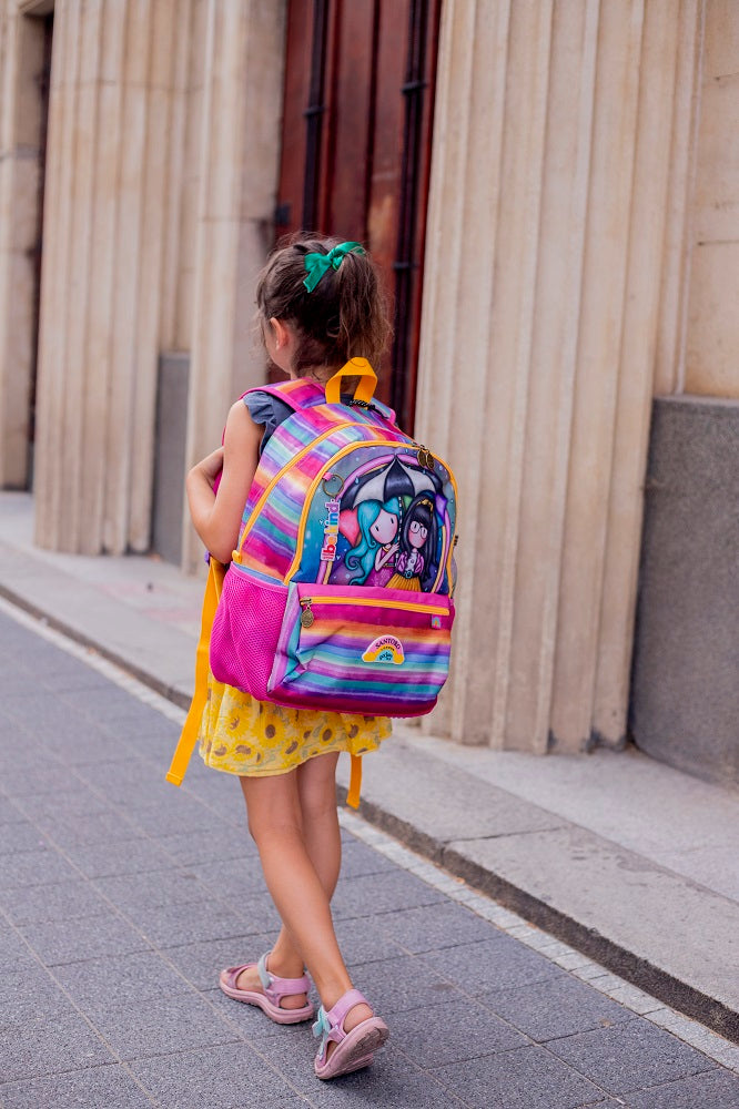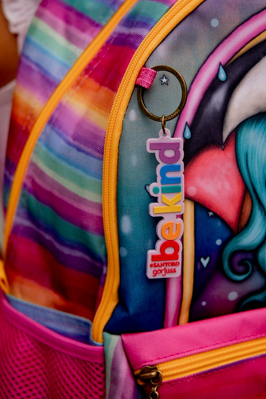 Ученическата раница Santoro Gorjuss "Be Kind To Each Other" е идеалният спътник за младите ученици, които търсят стил и практичност съчетани в едно. Раницата се състои от две обширни отделения с достатъчно обем вътре. Крайното просторно основно отделение се затваря със здрав объл цип с логото на Santoro Gorjuss. В него има малък самостоятелен джоб с цип. Позволява съхранение на учебници, тетрадки и други ученически принадлежности. Другото отделение е по-малко и отново се затваря с объл цип с логото на Santoro Gorjuss. Също така е закачен гумен ключодържател с надпис ”be kind”.Отпред в долната част има голям дълбок джоб, в който може да стоят портмонето, телефонът или пък ключовете на детето ви. Затваря се със здрав объл цип с логото на Santoro Gorjuss. Върху него има пришит голям гумен бадж Santoro Gorjuss с формата на дъга. Раница е удобна за носене, благодарение на здравите, подплатени и регулируеми презрамки. Освен това разполага с ергономичен гръб, дръжка за хващане и два странични джоба за бутилката за вода на ученика.Раницата е изработена от полиестер. Размери: 30 x 43 x 20 cm