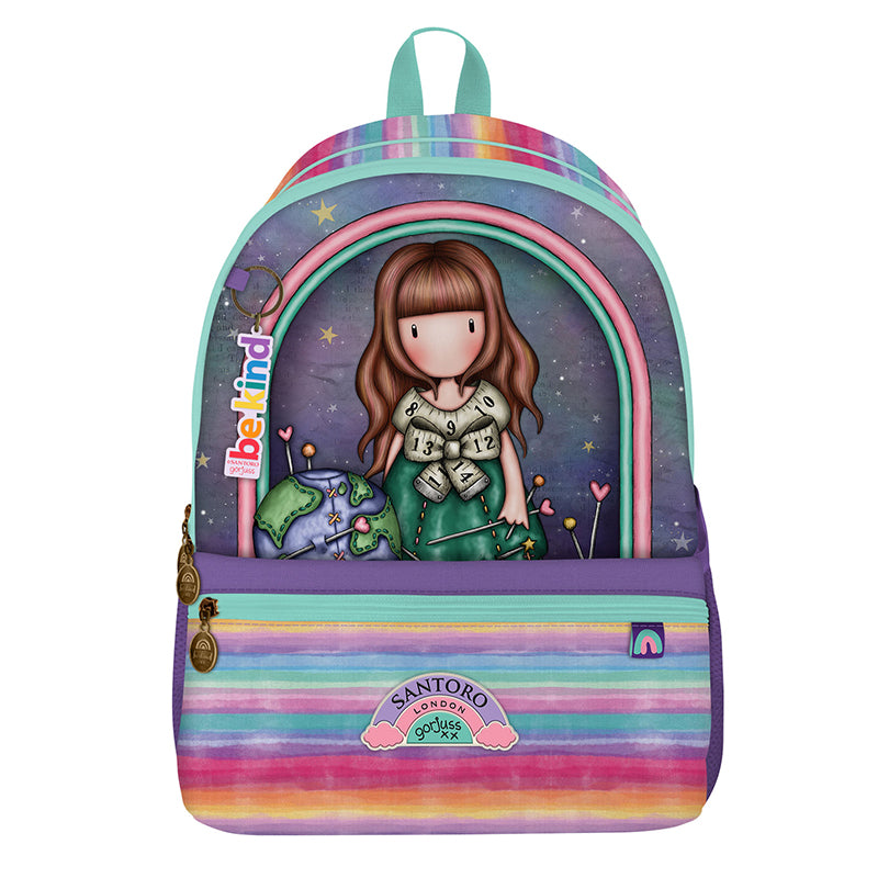 Ученическата раница Santoro Gorjuss "Be Kind To Our Planet" е идеалният спътник за младите ученици, които търсят стил и практичност съчетани в едно. Раницата се състои от две обширни отделения с достатъчно обем вътре. Крайното просторно основно отделение се затваря със здрав объл цип с логото на Santoro Gorjuss. В него има малък самостоятелен джоб с цип. Позволява съхранение на учебници, тетрадки и други ученически принадлежности. Другото отделение е по-малко и отново се затваря с объл цип с логото на Santoro Gorjuss. Също така е закачен гумен ключодържател с надпис ”be kind”.Отпред в долната част има голям дълбок джоб, в който може да стоят портмонето, телефонът или пък ключовете на детето ви. Затваря се със здрав объл цип с логото на Santoro Gorjuss. Върху него има пришит голям гумен бадж Santoro Gorjuss с формата на дъга. Раница е удобна за носене, благодарение на здравите, подплатени и регулируеми презрамки. Освен това разполага с ергономичен гръб, дръжка за хващане и два странични джоба за бутилката за вода на ученика.Раницата е изработена от полиестер. Размери: 30 x 43 x 20 cm