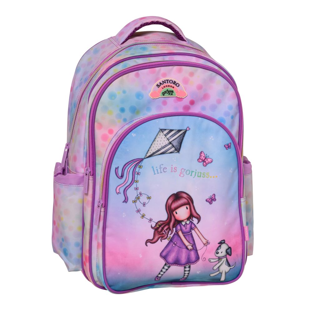 Ученическата раница Santoro Gorjuss Don´t Fly Away е лека и удобна, със страхотна визия и практично разпределение на вътрешното пространство. Тя е изработена от висококачествен материал и ще осигури несравним комфорт по време на носене. Характеристики: 2 основни отделения, които се затварят със здрави и стабилни ципове; 1 голям преден джоб; 2 странични джоба за бутилката за вода на ученика; регулируеми, подсилени и подплатени презрамки; дръжка за носене в ръка; подплатен, анатомичен гръб; материал - полиестер. Размери: 30 х 44 х 14 cm