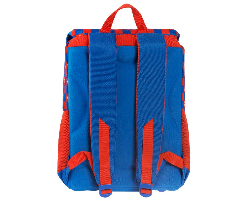 Ученическа раница с богата функционалност с 2 големи отделения и два предни джоба с класически дизайн на SUPER MARIO.Оригинален лицензен продукт.Основно голямо отделение, до самия гръб на раницата с малък джоб с цип за съхранение на бележник или малки документи. Второ голямо отделение. И двете отделения се пристягат с шнур. Джоб на предния капак и етикет за надписване под самия капак. Допълнителен преден джоб.Обемен принт на SUPER MARIO на предния панел на раницата.Два мрежести странични джоба за бутилки за вода.Затваряне на всички отделения със здрави ципове и брандирани гумени накрайници.Регулируем обем на раницата, чрез двустранни пристягащи ципове. Твърд анатомичен вентилиран гръб от мемори пяна и дъно също от мемори пяна и предпазващи износването бутони.Червена ергономична, здрава и удобна ръкохватка (дръжка).Подплатени против изпотяване от вътрешната страна регулируеми презрамки.