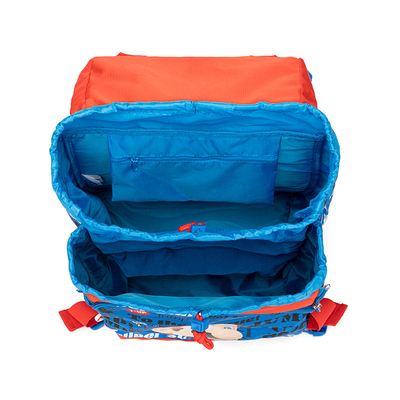 Основното голямо отделение, до самия гръб на раницата, има малък джоб с цип за съхранение на бележник или документи. Другото голямо отделение също е доста обширно. И двете са достатъчно просторни, за да съберат всичко необходимо за учебния ден. Има капак, който покрива тези две основни отделения. На него има джоб с обемен надпис “SUPER MARIO”, който се затваря със здрав цип с брандиран гумен накрайник.