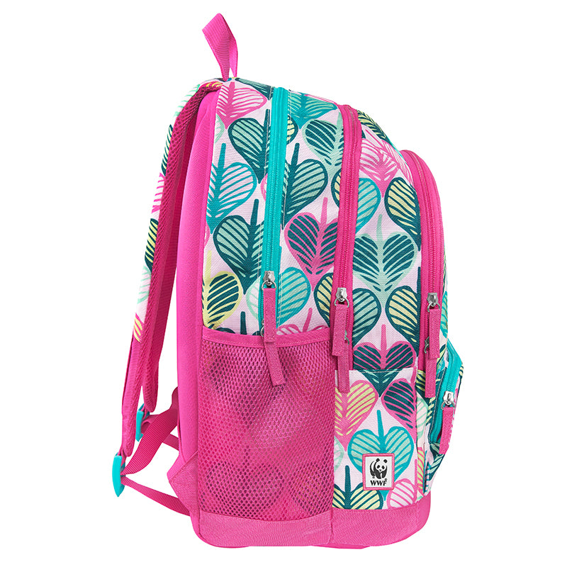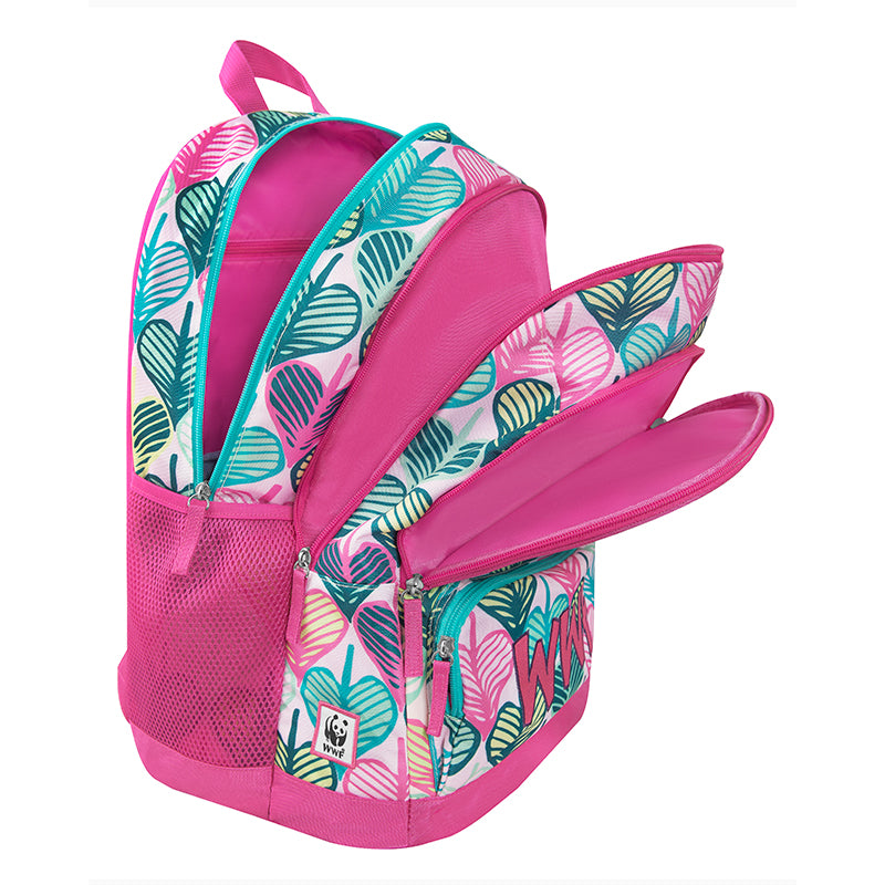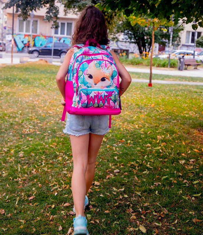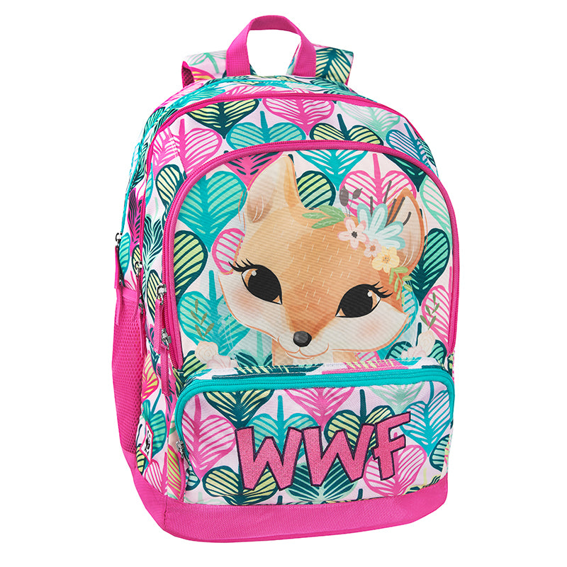 Три отделения, побиращи всички необходим материали на ученика. Две големи самостоятелни отделения отзад, които се затварят със здрави двойни ципове с розови текстилни накрайници. Най-задното отделение е със син цип, а предното с розов. Малък джоб за листчета, бележки и по-малки материали в най-задното отделение на раницата. Едно по-малко отделение отпред, затварящо се със здрав розов цип с текстилен розов накрайник. Малък джоб върху предния панел на раницата, идеален за съхранение на мокри и сухи кърпи, портфейл, тефтерче, бележки или други малки материали, затварящ се със здрав син цип с текстилен розов накрайник. Масивен и красив принт на сладка лисичка на предния панел на раницата. Висококачествена нашивка на логото на WWF върху джоба на предния панел.
