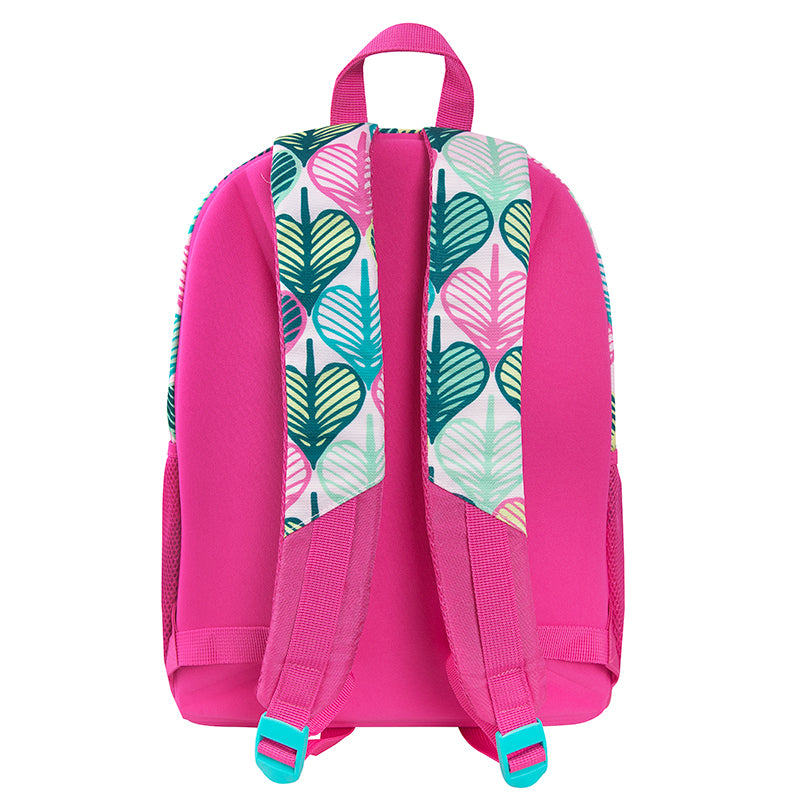 Здрави, странични мрежести розови джобове за бутилки за вода.Здрава, промазана, водоотблъскваща материя за лесно почистване. Надеждни, здрави шевове.Вентилиран анатомичен гръб с полета от обемна пяна. Регулируеми, чрез катарами, дишащи презрамки.Удобна и здрава розова дръжка. Подсилено дъно, също от изолиращата пяна.
