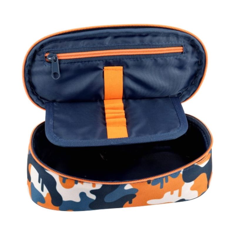 Едно голямо отделение, което събира всичко необходимо. Вътре – малък джоб с цип, както и разделяща‚ летяща преграда с ластици за моливи и химикали.