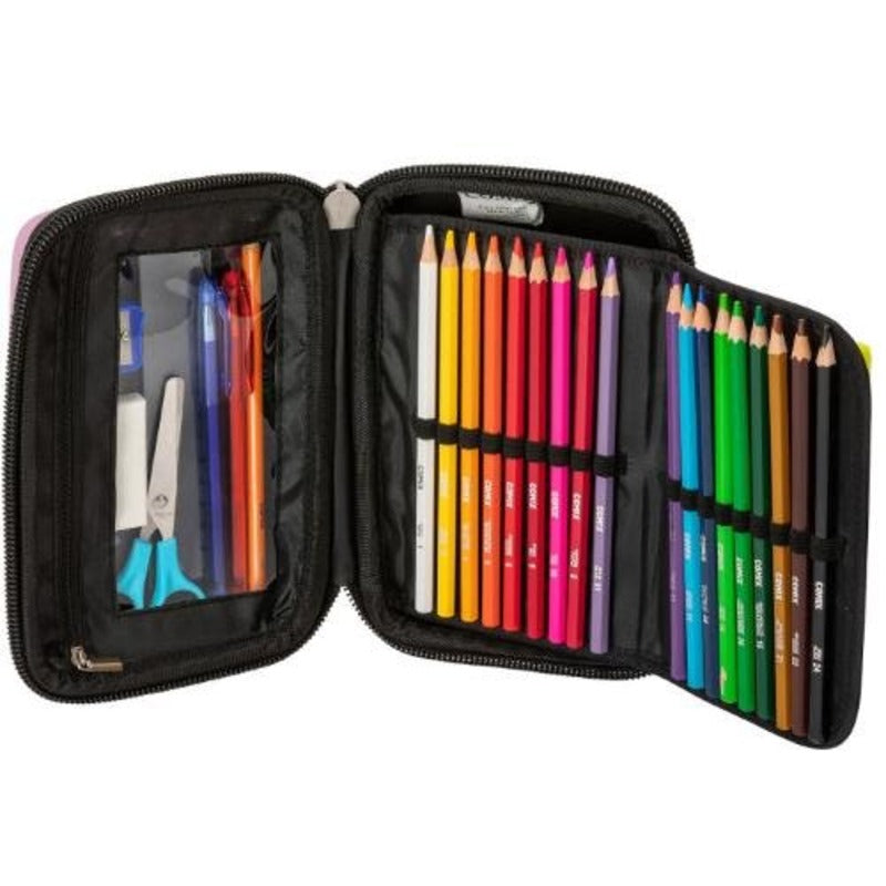 Атрактивен дизайн на несесер със съдържание. В основното отделение на твърд разделител под формата на „хармоника“ в ластичета, са разположени 18 цветни молива и 18 флумастера от италианската марка COMIX. Допълнителен вътрешен прозрачен джоб с цип в който са поставени линия, ножичка, острилка, гума, червен и син химикал и черен молив.