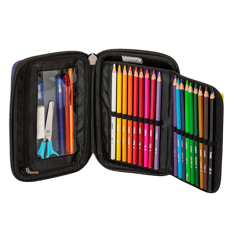 Атрактивен дизайн на несесер със съдържание. В основното отделение на твърд разделител под формата на „хармоника“ в ластичета, са разположени 18 цветни молива и 18 флумастера от италианската марка COMIX. Допълнителен вътрешен прозрачен джоб с цип в който са поставени линия, ножичка, острилка, гума, червен и син химикал и черен молив.