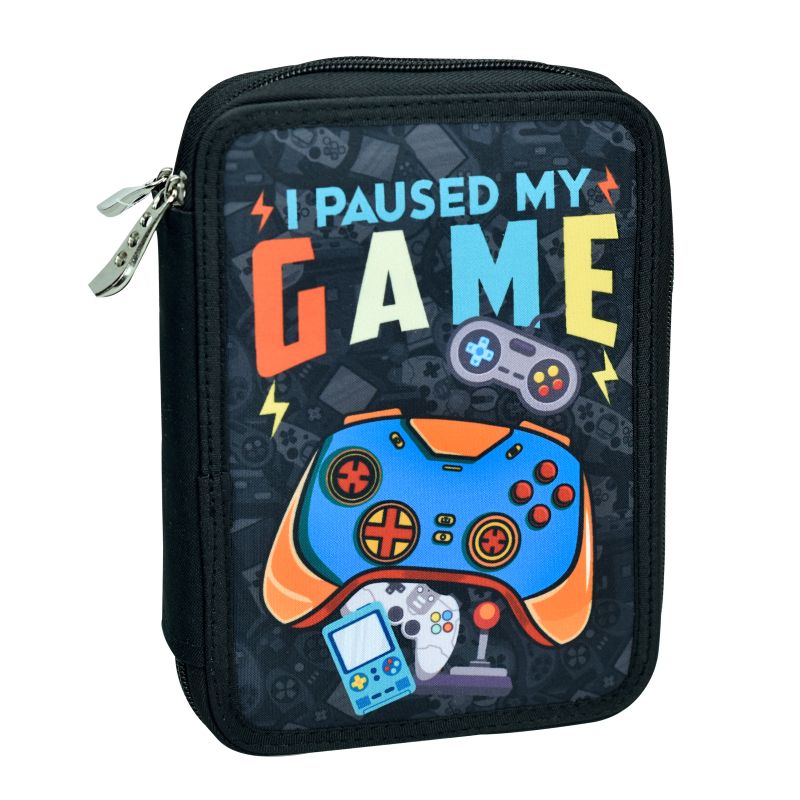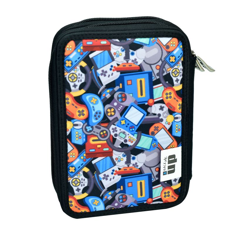 Здрави метални ципове. Принтове на игрални конзоли и джойстици на лицвата и задната страна на несесера.