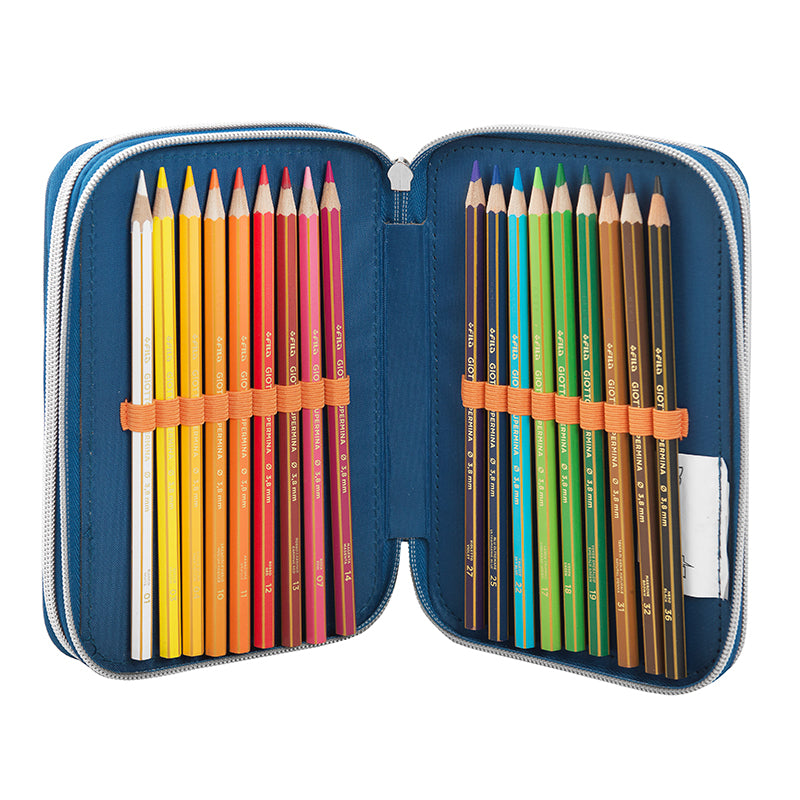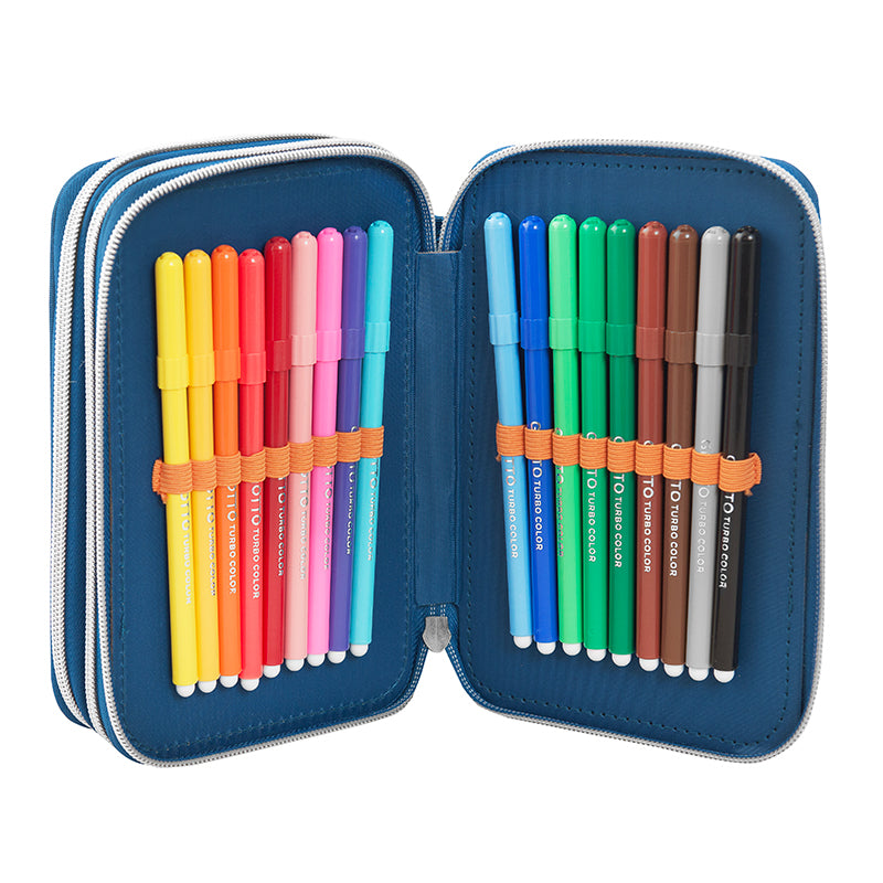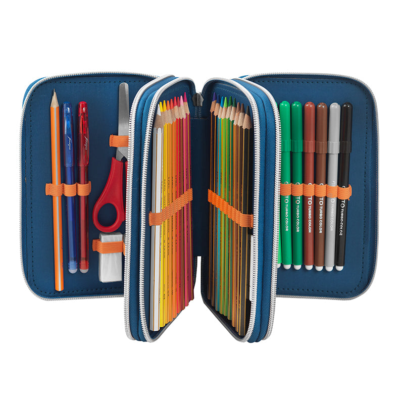 Съставен от три сегмента, обкантени с красиви шевове. Удобно вътре се носятмоливи и химикали, флумастери, гумичка, острилка, триъгълник и линия.