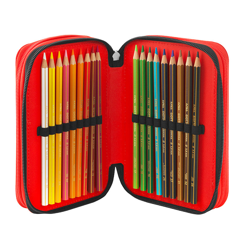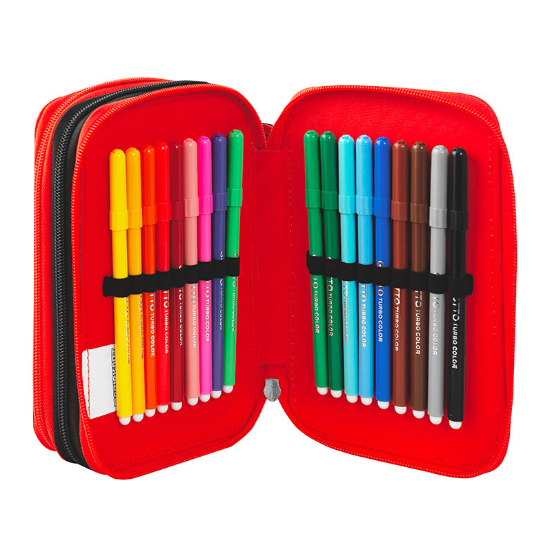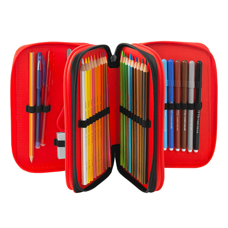 Съставен от три сегмента, обкантени с красиви шевове. Удобно вътре се носятмоливи и химикали, флумастери, гумичка, острилка, триъгълник и линия.