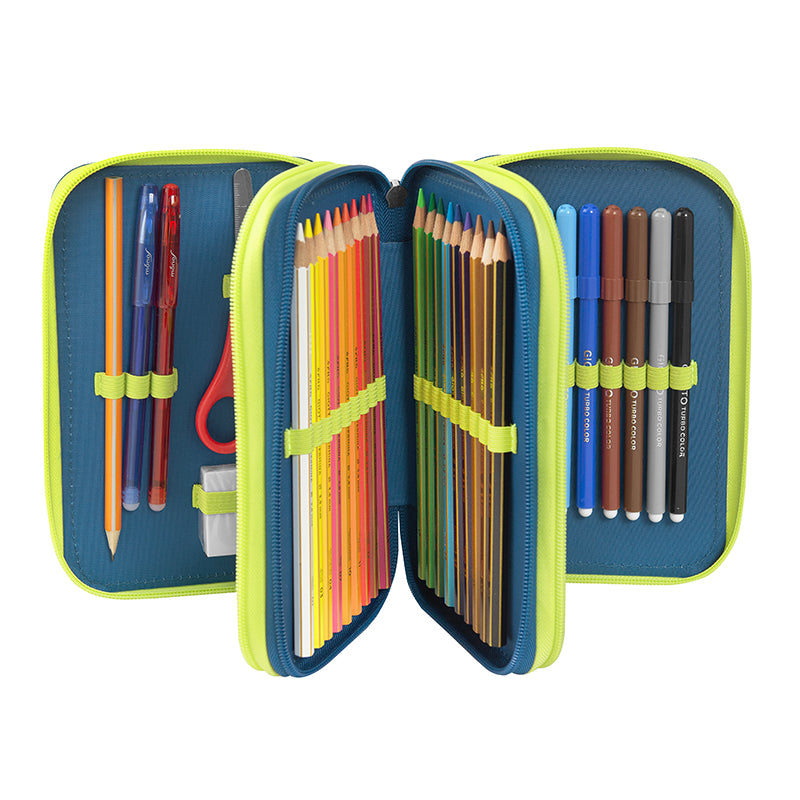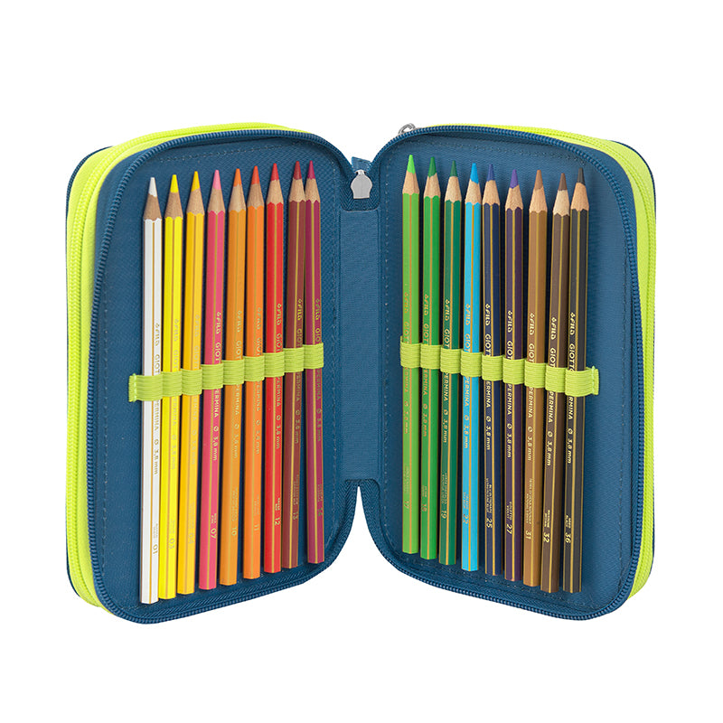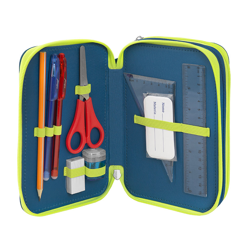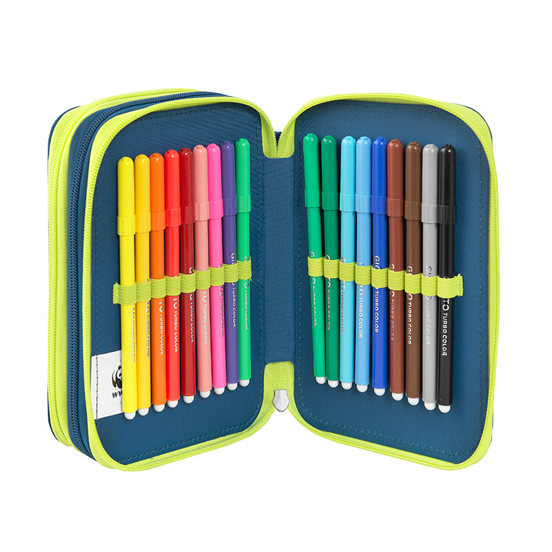 Съставен от три сегмента, обкантени с красиви шевове. Удобно вътре се носятмоливи и химикали, флумастери, гумичка, острилка, триъгълник и линия.