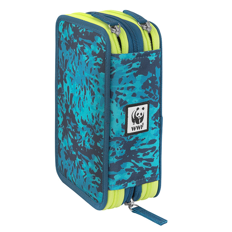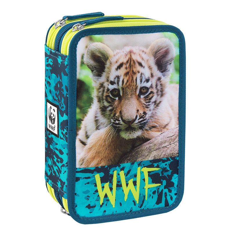 Уникален панел със синя тигрова разцветка и изображение на сладко тигърче. Стилен принт WWF е долната част на панела. Първото и третото отделение са в по-светъл нюанс на зелено, а средното в тъмен нюанс на зеления цвят. Метални ципове с тъмен текстилен зелен накрайник.