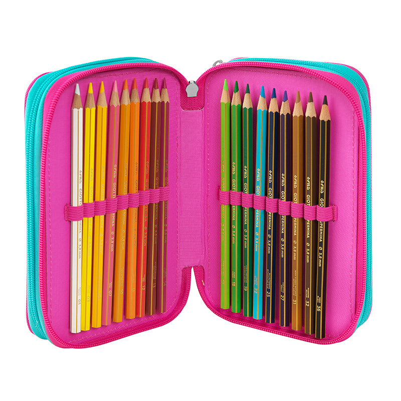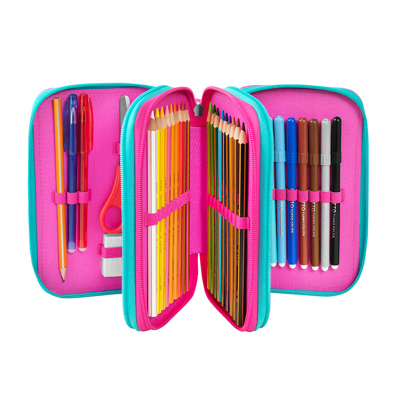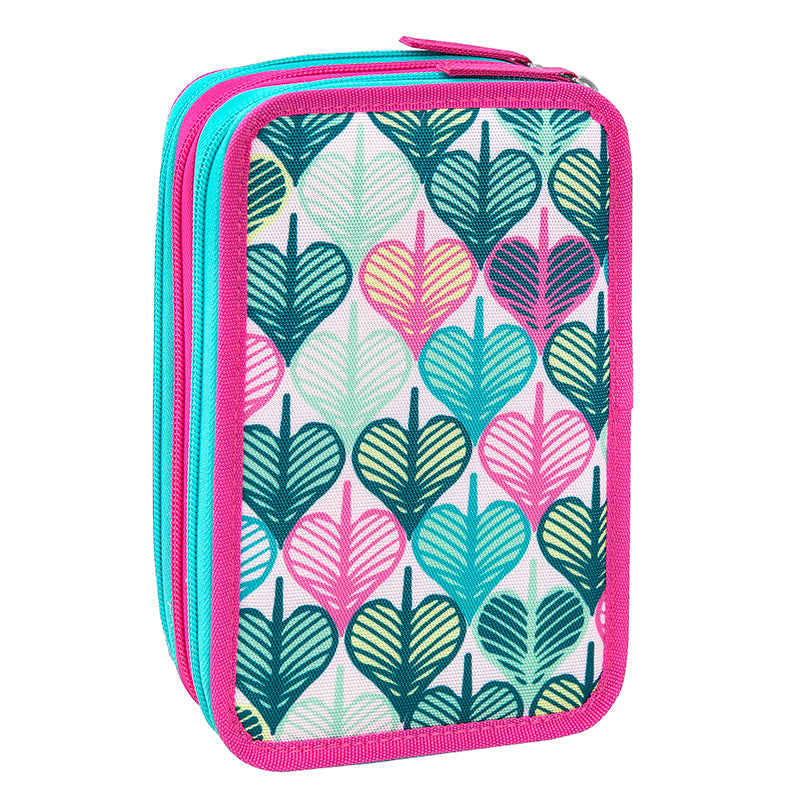Съставен от три сегмента, обкантени с красиви шевове. Удобно вътре се носятмоливи и химикали, флумастери, гумичка, острилка, триъгълник и линия.
