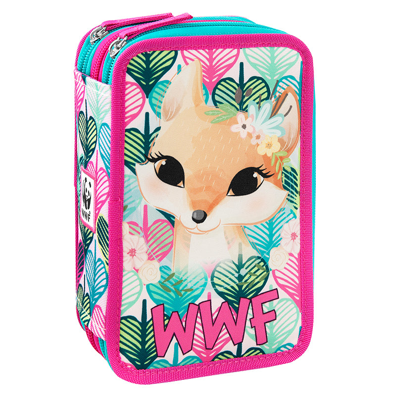 Страхотен цветен и нежен панел с изображение на красива лисичка и принтирано лого на WWF. Първото и третото отделение са сини, а средното розово. Метални ципове с текстилни розови накрайници.