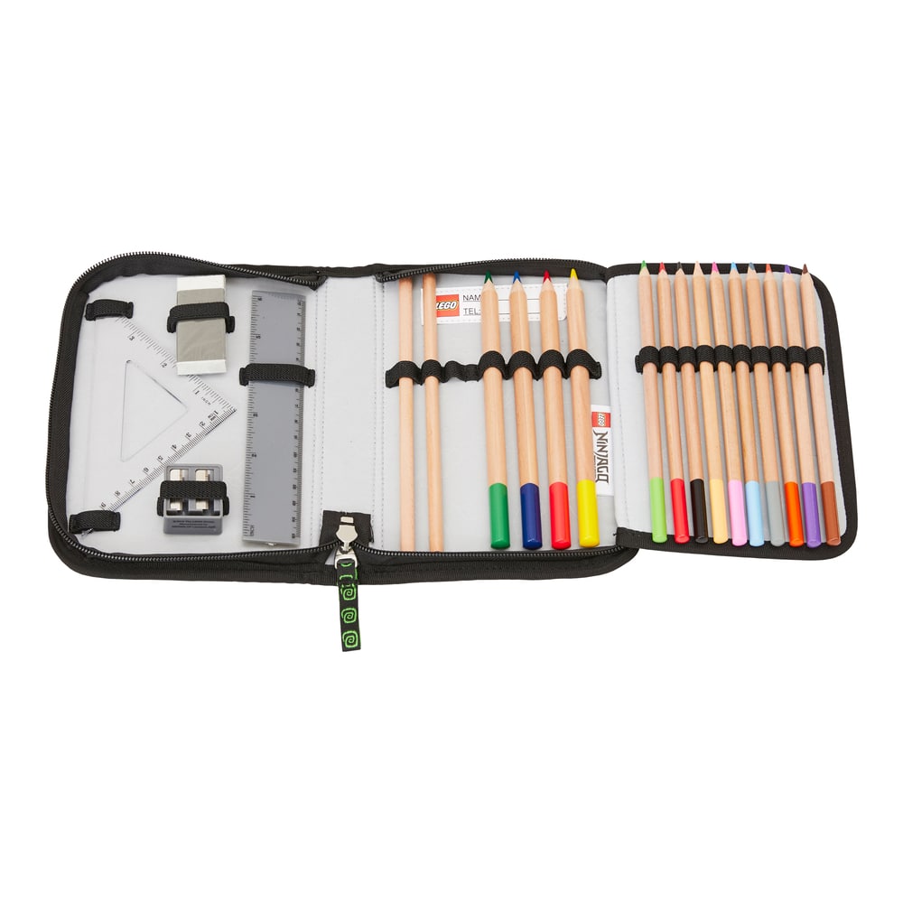 Ученически несесер Ninjago, чудесно допълнение към всякa раница на LEGO. Едно голямо основно отделение. Съставен от три сегмента, които се събират в общо тяло, затворено с цип. Вътре се подреждат моливи и химикали, гумичка, острилка, триъгълник и линия. LEGO картонена бланка за ученическа програма и вписване името на ученика. Снимките на вътрешността на несесера са илюстративни.