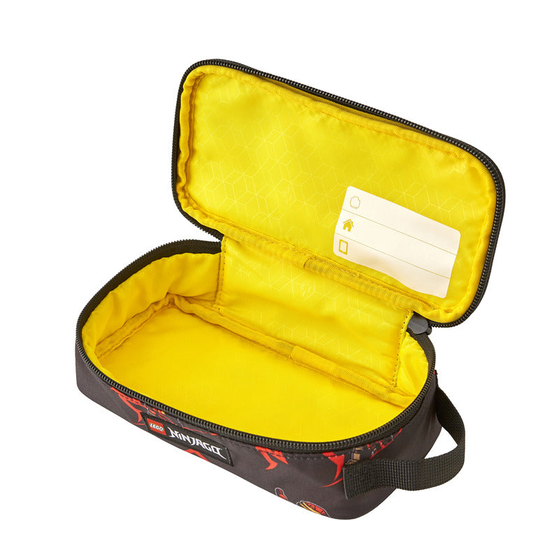 Дизайн, специално разработен за деца, които не искат да си губят времето с подреждане на ученическите принадлежности в несесера. Водоотблъскваща материя, която трудно задържа мръсотия. Стабилен цип с метален накрайник, завършващ с черен iconic LEGO елемент. Несесерът е с удобна ръкохватка за носене.Нашивка LEGO NINJAGO от предната страна. Едно голямо основно отделение с жълт хастар, в което се събират моливи и химикали, гумичка, острилка, триъгълник, линияи етикет за надписване имената на детето.