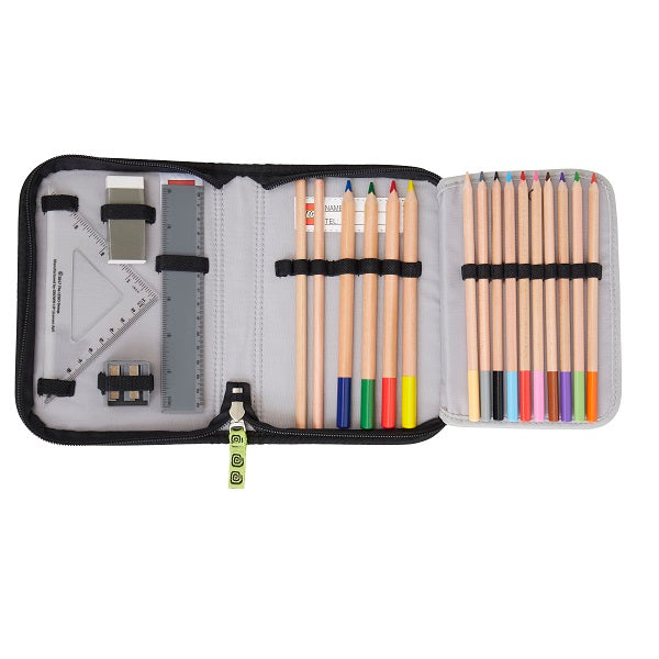 Страхотен ученически несесер, допълнение към всяка Ninjago раница. Идеален за комплект с LEGO раница. Съставен от три сегмента, обкантени с гумени ленти, които се събират в общо тяло, затворено с цип. Удобно вътре се носят моливи и химикали, гумичка, острилка, триъгълник, и линия. LEGO етикет за вписване името на ученика.