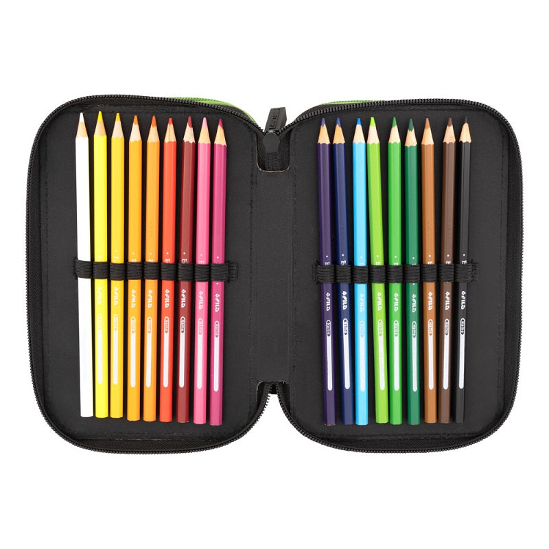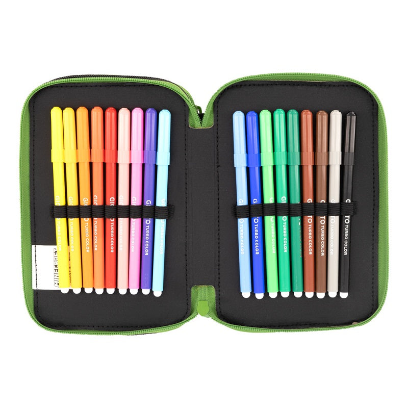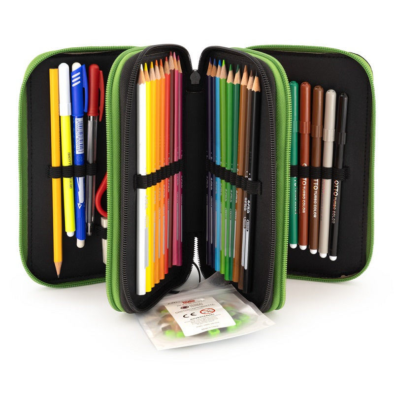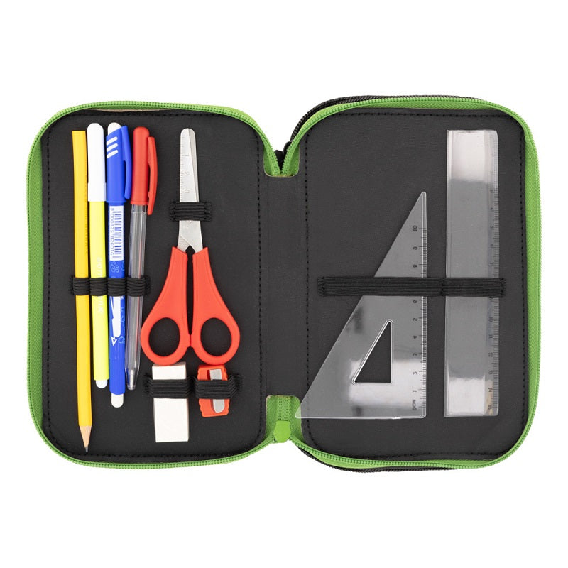 Съставен от три сегмента, обкантени с красиви шевове. Удобно вътре се носят моливи и химикали, фулмастри гумичка, острилка, триъгълник, транспортир и линия.