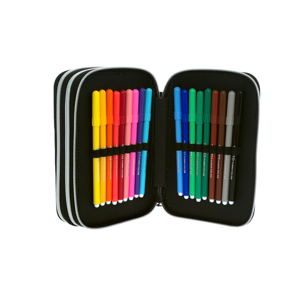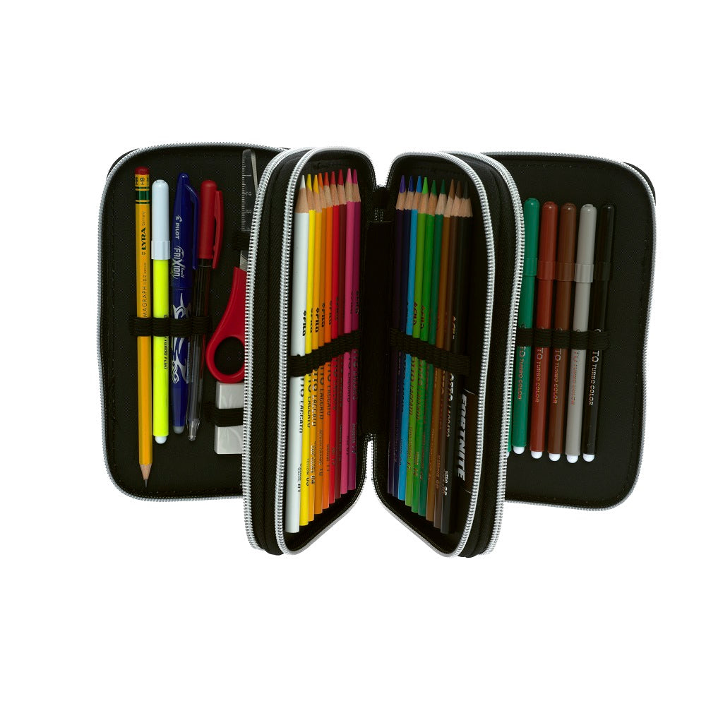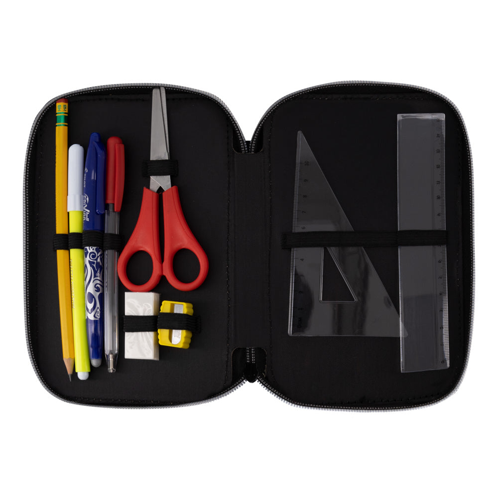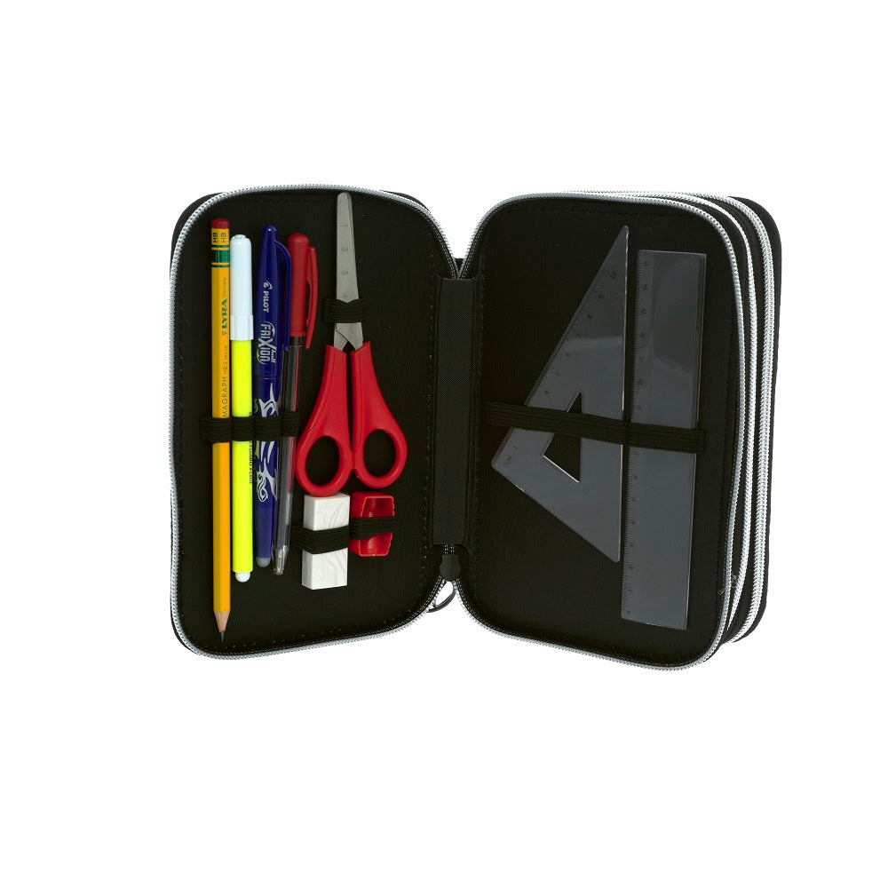 Съставен от три сегмента в изчистено черно с отличителни мрежести полета. Удобно вътре се носят моливи и химикали, фулмастри гумичка, острилка, триъгълник и линия. Ичистен черен хастар. Стабилни и здрави ципове. Сребтисти ципове с накрайници черни рингове .