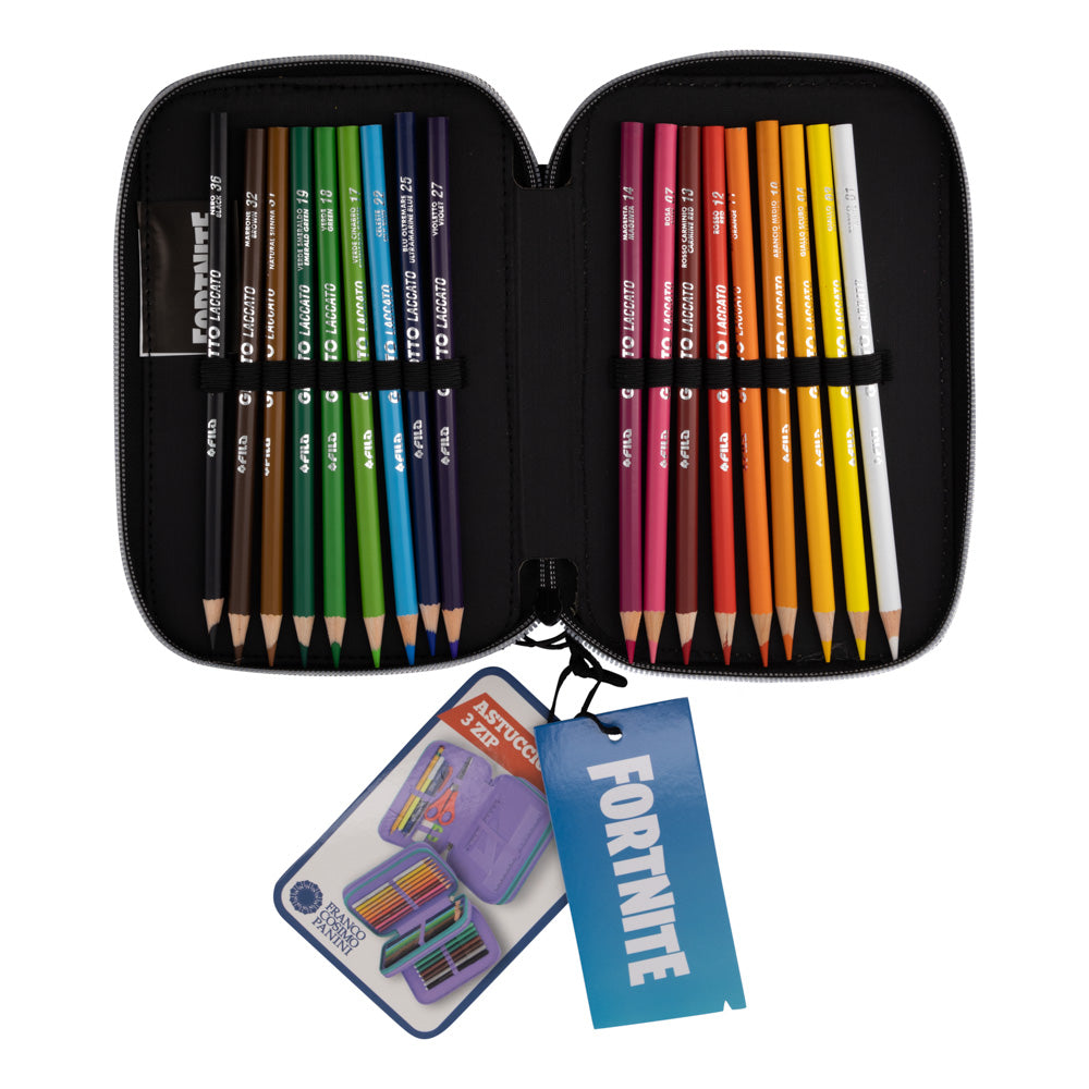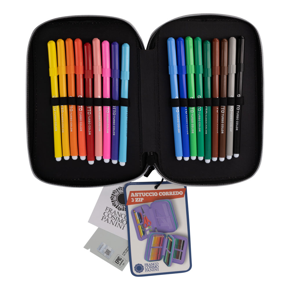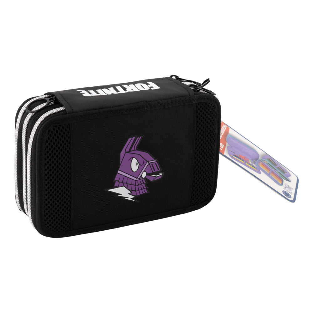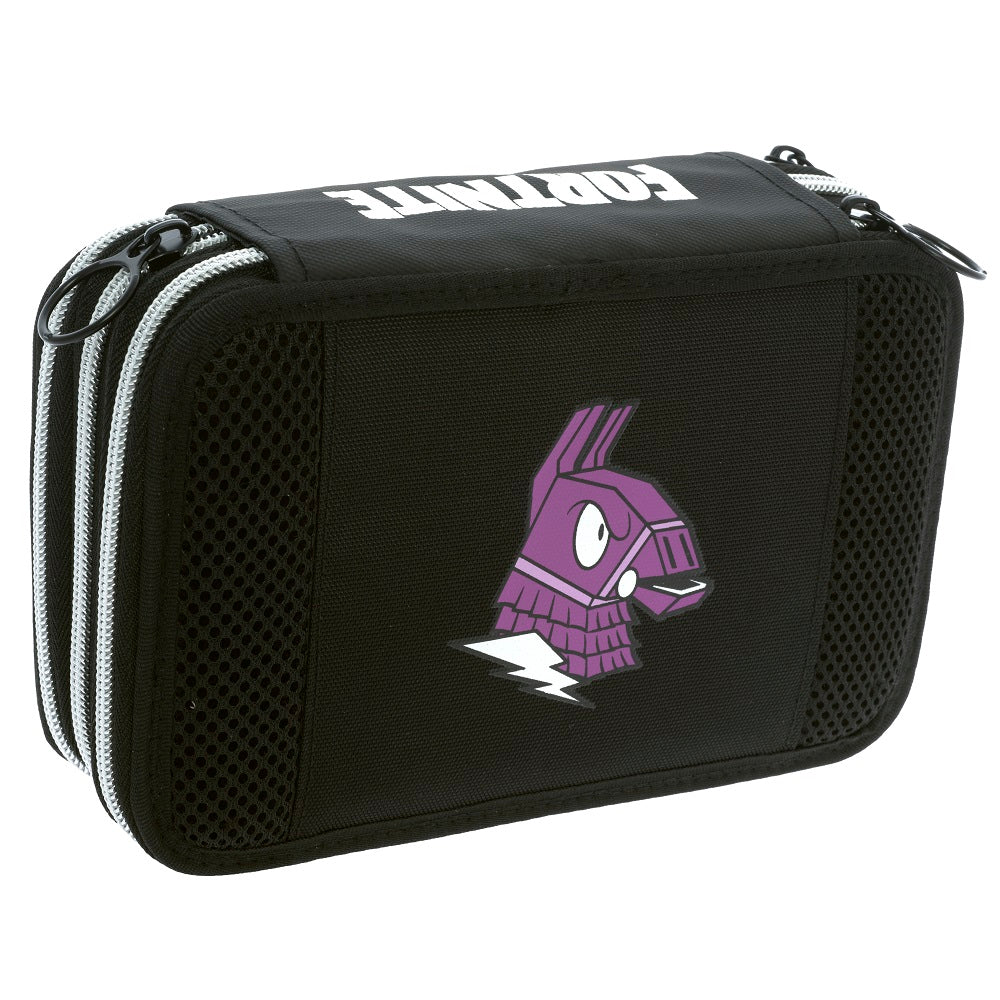 Страхотен ученически троен несесер, допълнение към раница FORTNITE. Страхотен  принт на глава на лама на предния панел и принт FORTNITE на страничния панел.