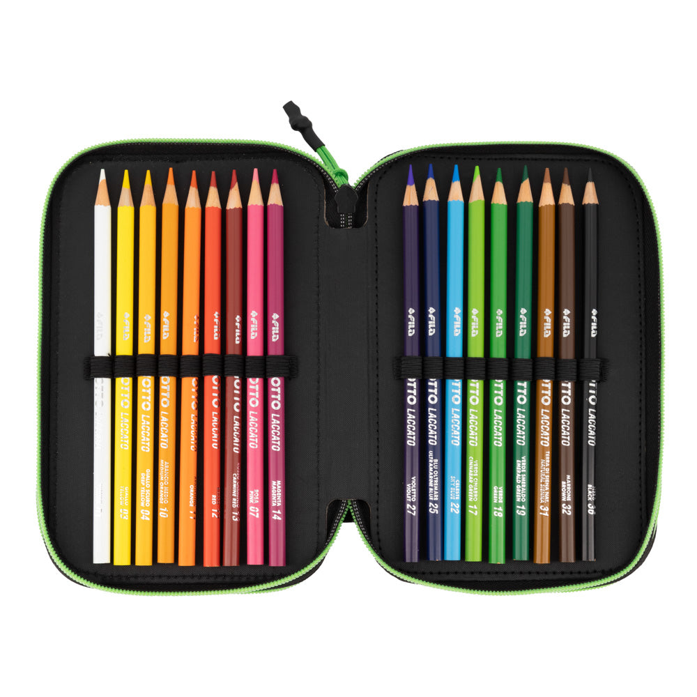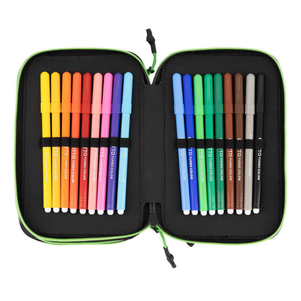 Съставен от три сегмента. Удобно вътре се носят моливи и химикали, фулмастри гумичка, острилка, триъгълник и линия. Изчистен черен хастар. Стабилни и здрави ципове.