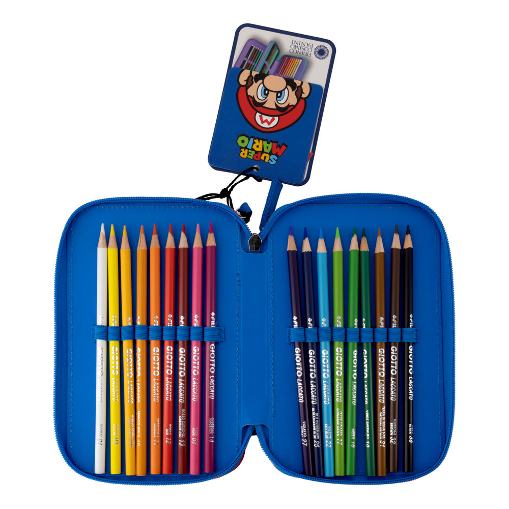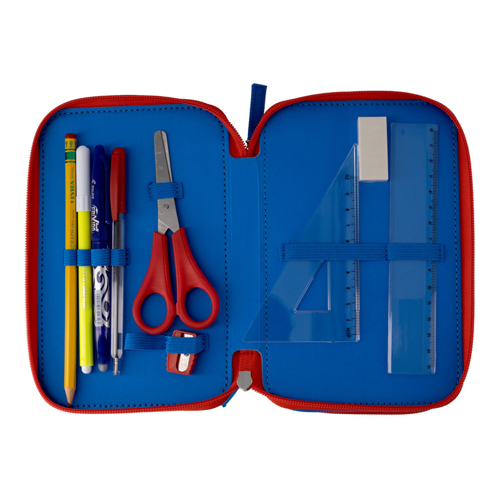 Съставен от три сегмента в цветовете синьо и червено, обкантени с красиви шевове. Удобно вътре се носят моливи и химикали, фулмастри гумичка, острилка, триъгълник и линия. Стабилни и здрави ципове. Гумен и текстилни накрайници Super Mario на ципа.