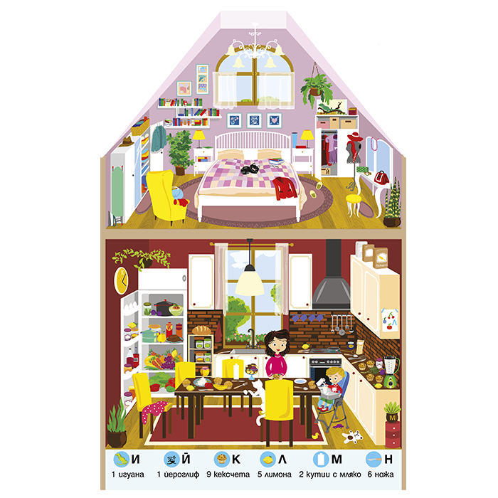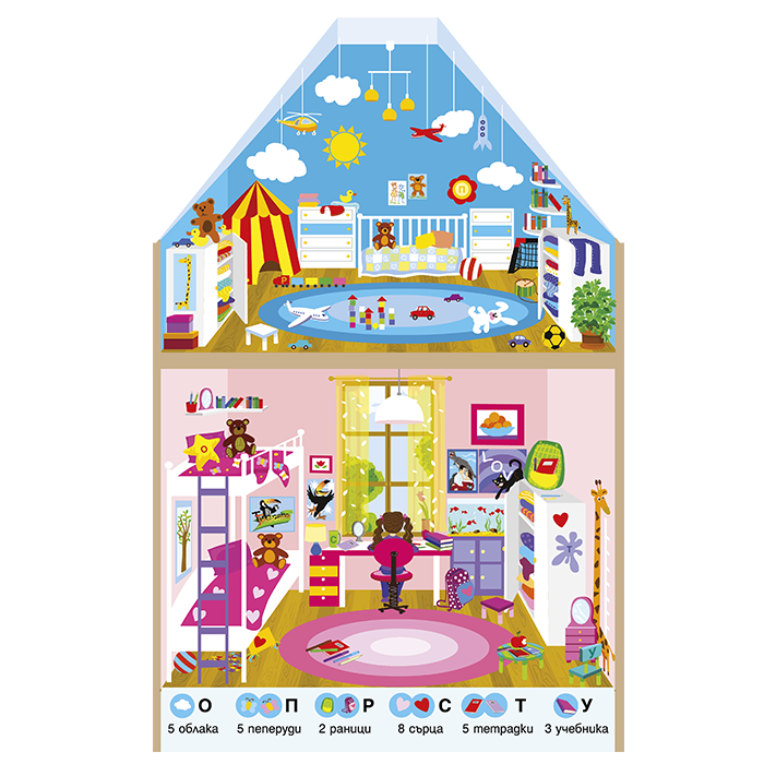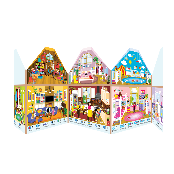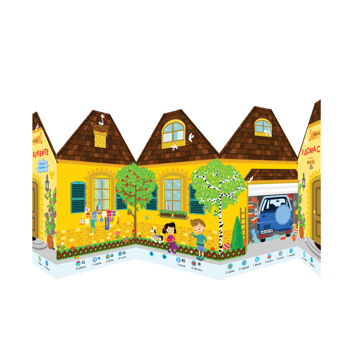 Представлява къщичка от пено картон с височина 30 см, която се разгъва. В нея децата ще могат да откриват букви от азбуката, както и определен брой предмети започващи със същите букви.