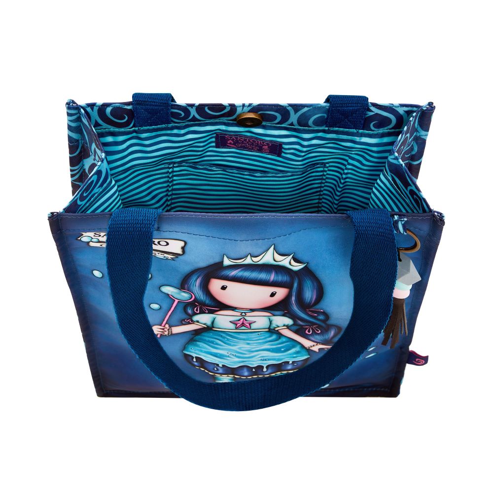 Чантата е с магичен дизайн в морско синьо, наподобяващ вълни. А върху тях Gorjuss момиче със сини коси, вързани на две опашки, създава водни мехурчета.