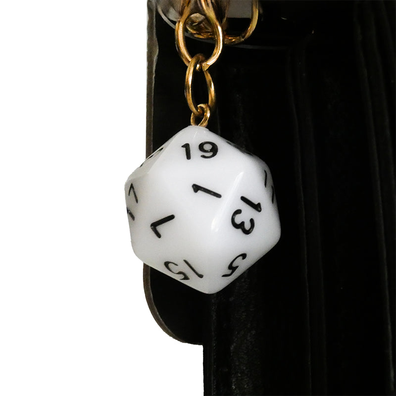 Малък зар от Dungeons & Dragons, прикрепен към ципа за допълнителен гик ефект.
