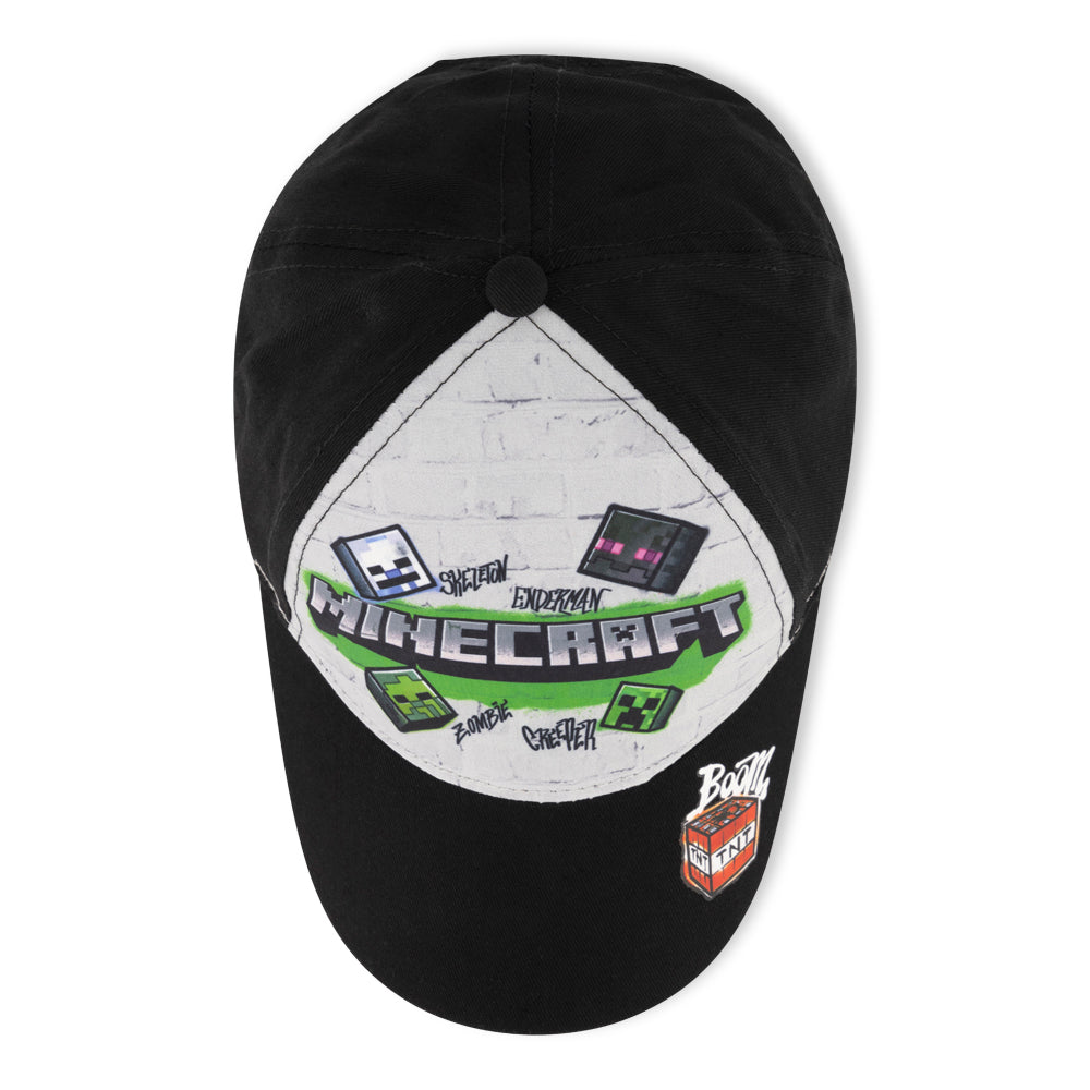 Бейзболна шапка Minecraft с черна козирка. Урбан графити принт на предния панел с логото MINECRFAT, квадратните глави на Skeleton, Enderman, Zombie и Creeper. На козирката Boom, TNT.