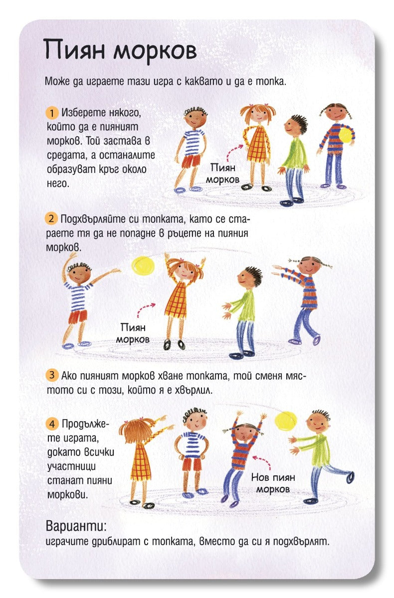 Игрите са 100 и са най-различни – от такива които изискват отворени пространства и топка („Пиян морков“ и „Дремещи кученца“), през игри за дълъг път („Изяж азбуката“ и „Игра за наблюдателни“), до такива, които могат да се играят в дъждовно време – „Смигащият убиец“ и „Разкажи история“.