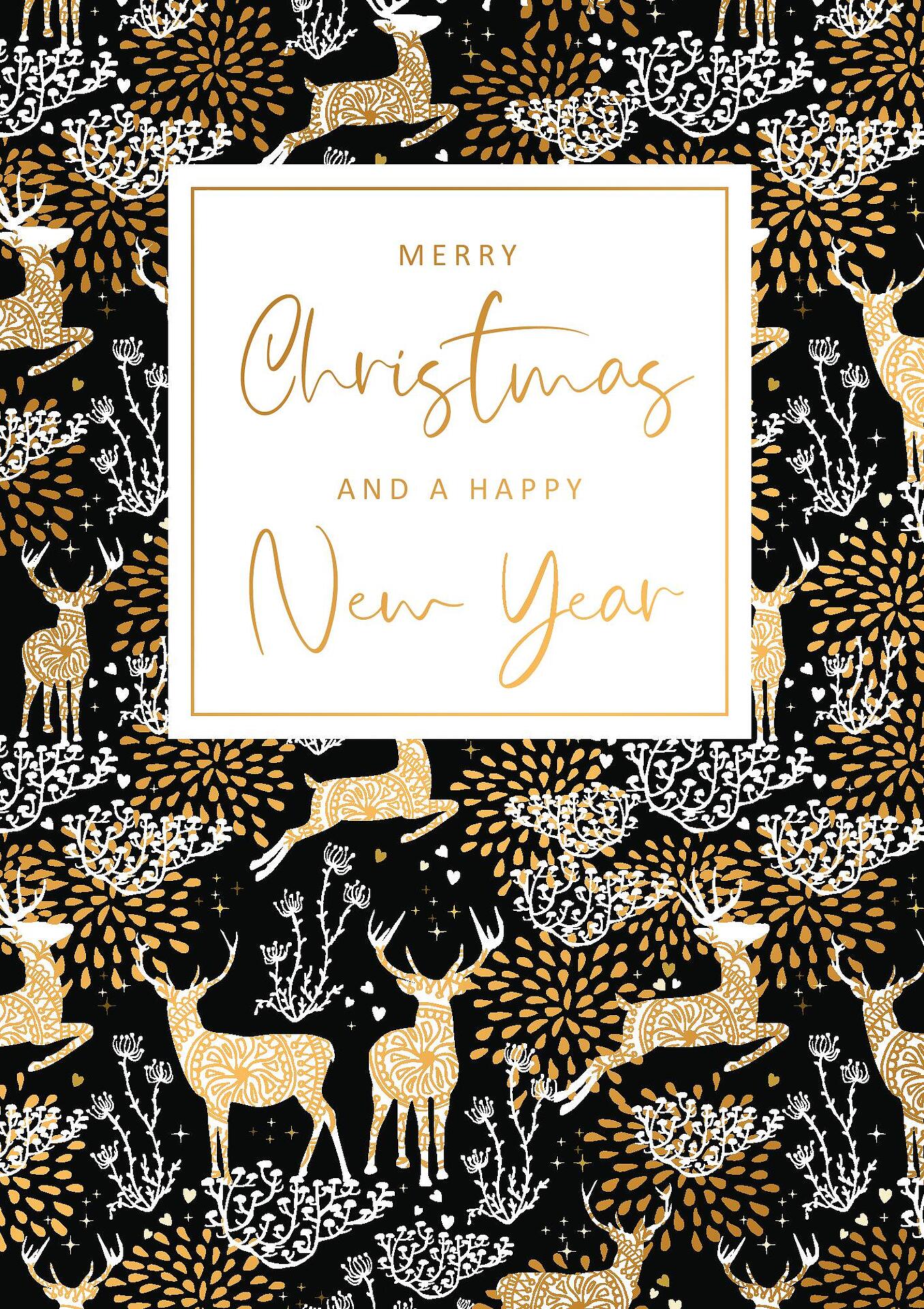 Поздравителна коледна картичка с елени – стилна и празнична.