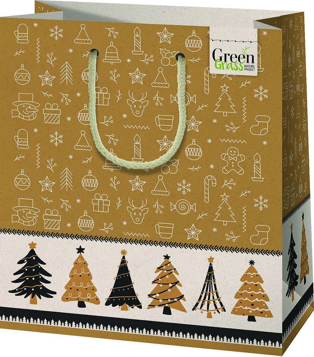 Екологична подаръчна торбичка от трева, размер M 20х23, с дизайн Златна с елхи.