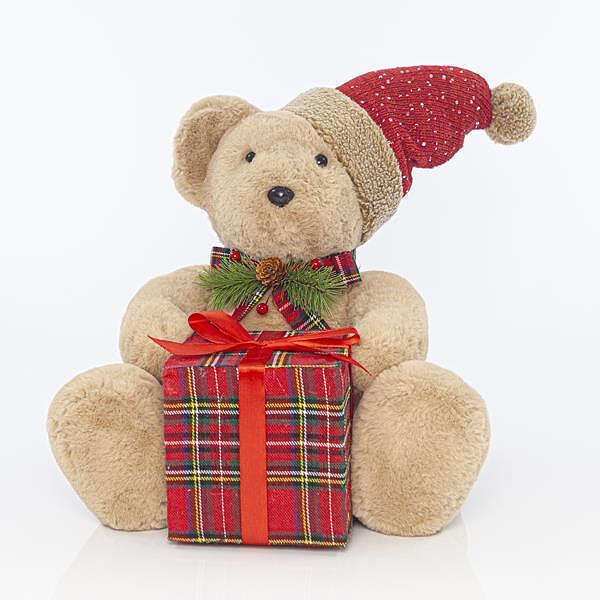 Тази очарователна коледна плюшена мечка е перфектният акцент към празничната атмосфера у дома. Облечена в топли зимни дрешки и държаща малко подаръче, тя носи усещане за уют, любов и коледна магия.