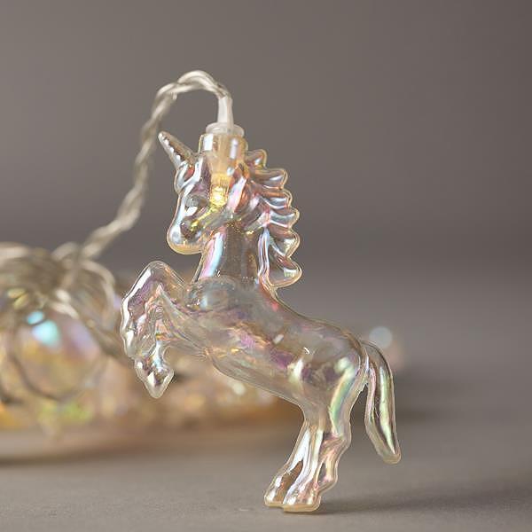 Светлинен гирлянд с 10 LED еднорози, работи с батерия и таймер.